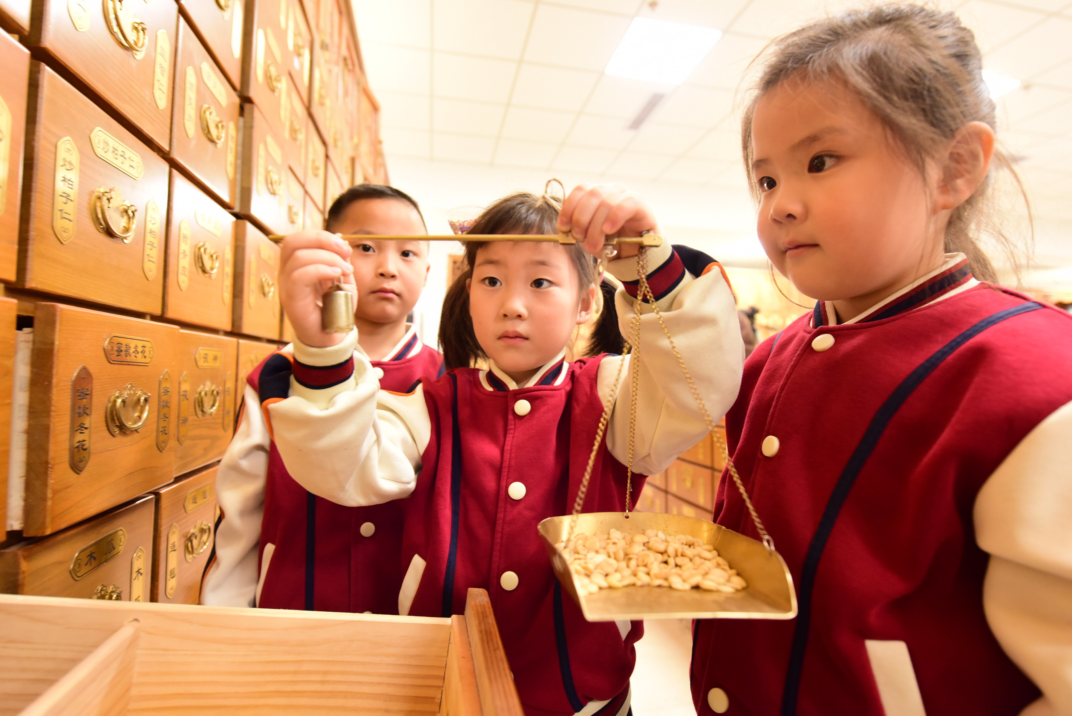 江蘇省連云港市東??h西雙湖幼兒園小朋友正在中醫(yī)院體驗(yàn)中藥材飲片稱重。張玲? 攝