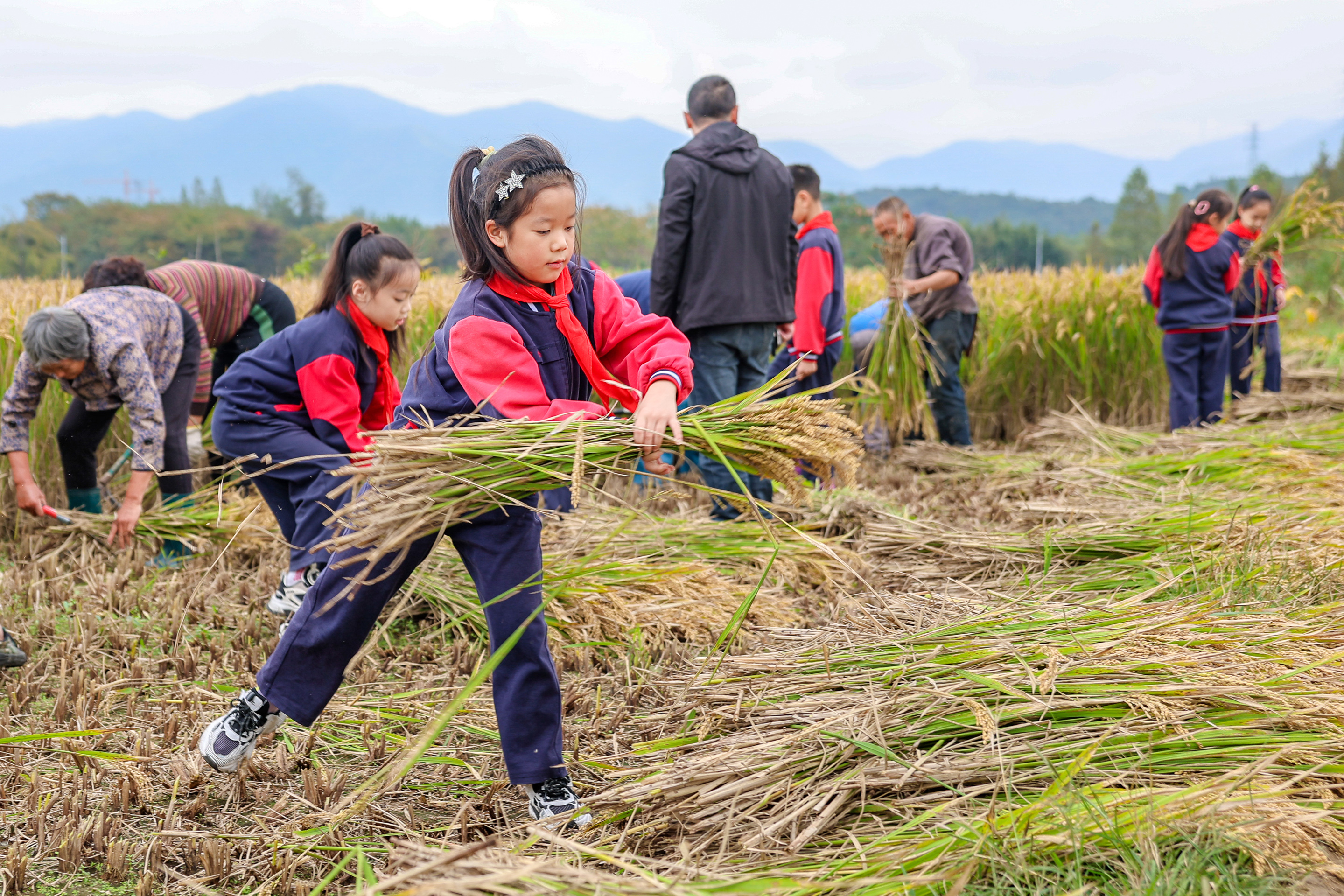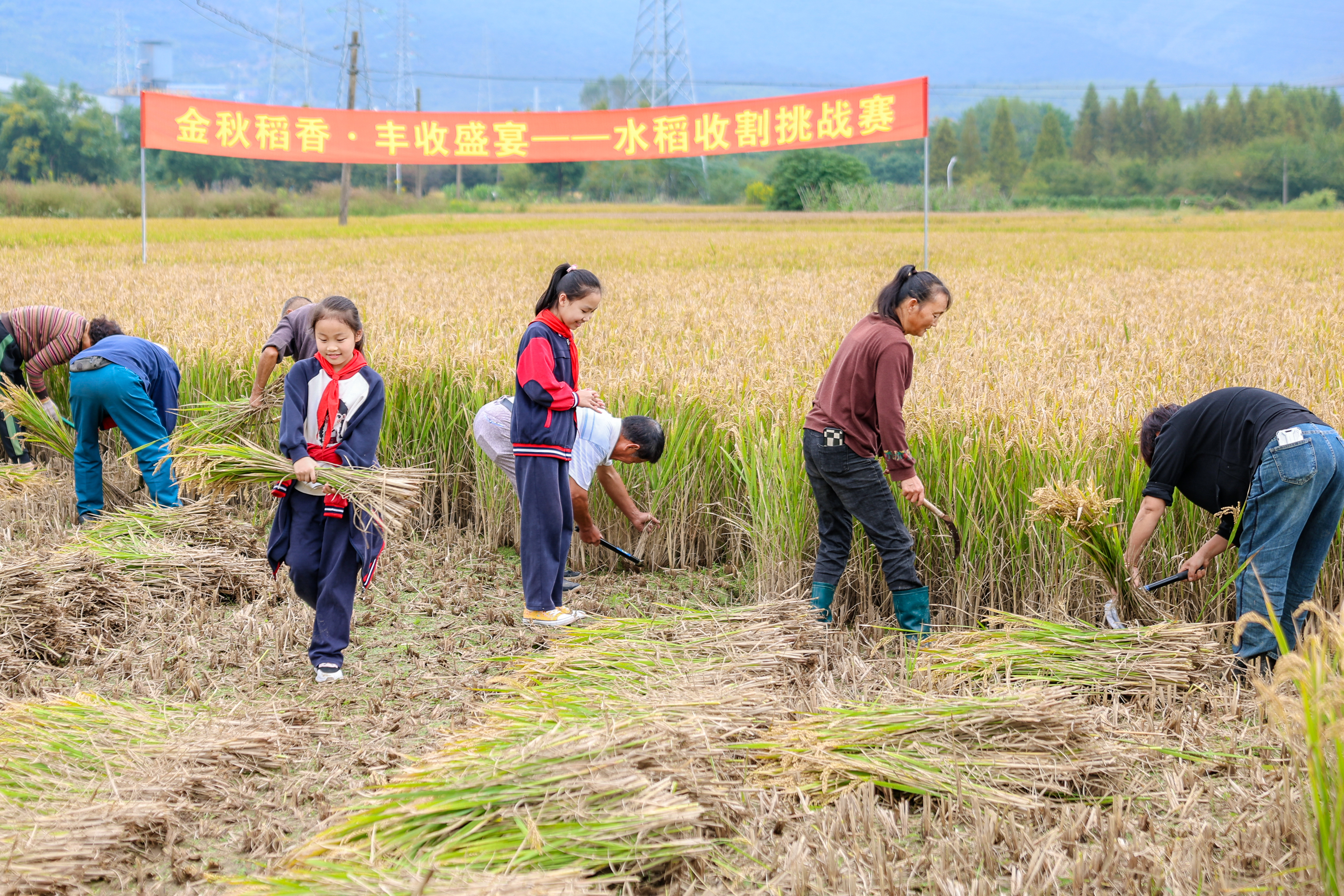 浙江省湖州市長興縣煤山鎮(zhèn)五通村外的稻田,學(xué)生們和村民在舞動鐮刀參加割稻比賽。吳拯 攝