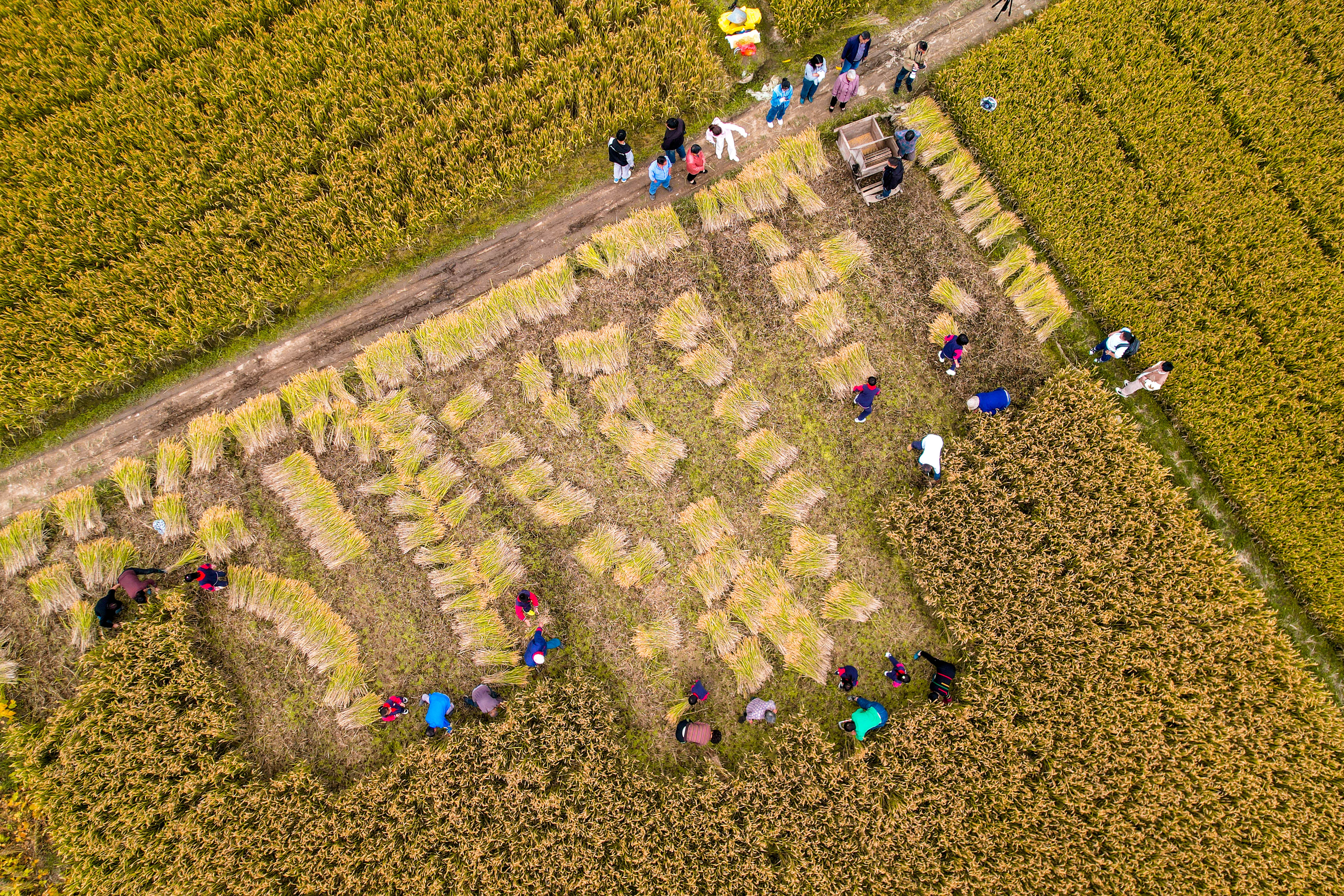 10月21日,浙江省湖州市長興縣煤山鎮(zhèn)中心小學(xué)開展“金秋稻香”手工割稻比賽,學(xué)生們和村民在金色的田野里割稻子、打谷子,在緊張激烈的角逐中體驗豐收的樂趣,感受傳統(tǒng)農(nóng)耕文化。(中國教育報-中國教育新聞網(wǎng)通訊員 吳拯 攝)