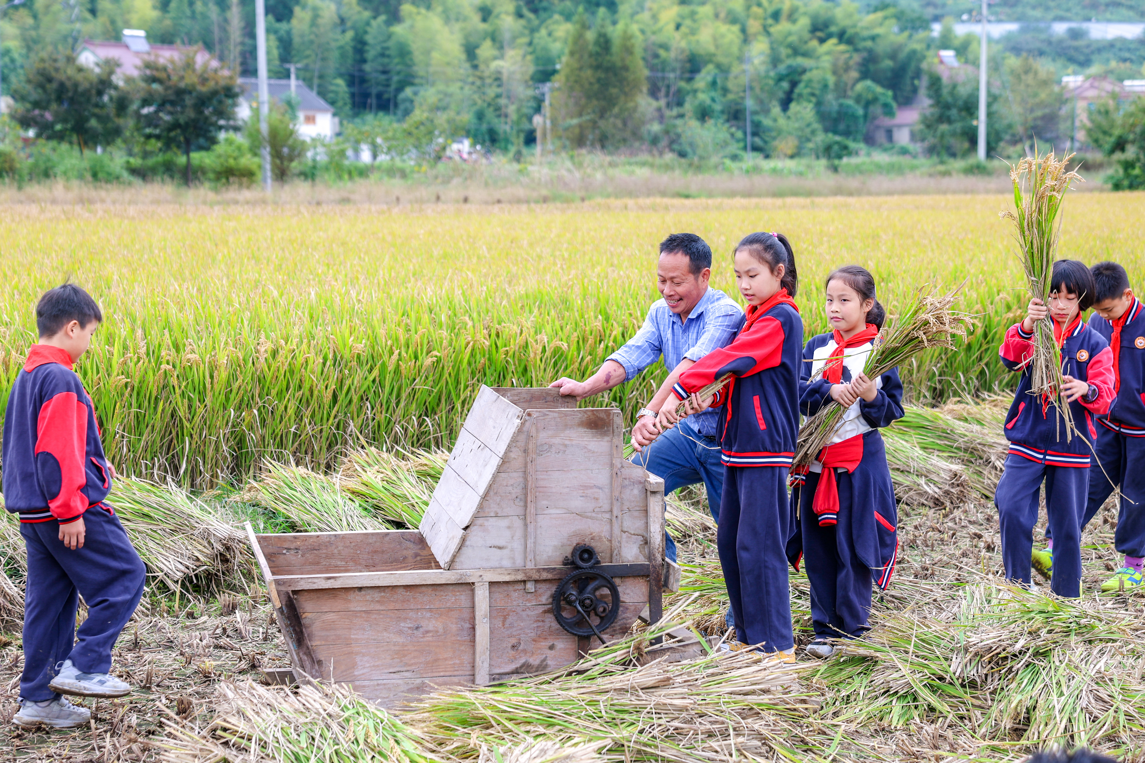 浙江省湖州市長興縣煤山鎮(zhèn)五通村外的稻田,學(xué)生們在體驗打稻谷。吳拯 攝