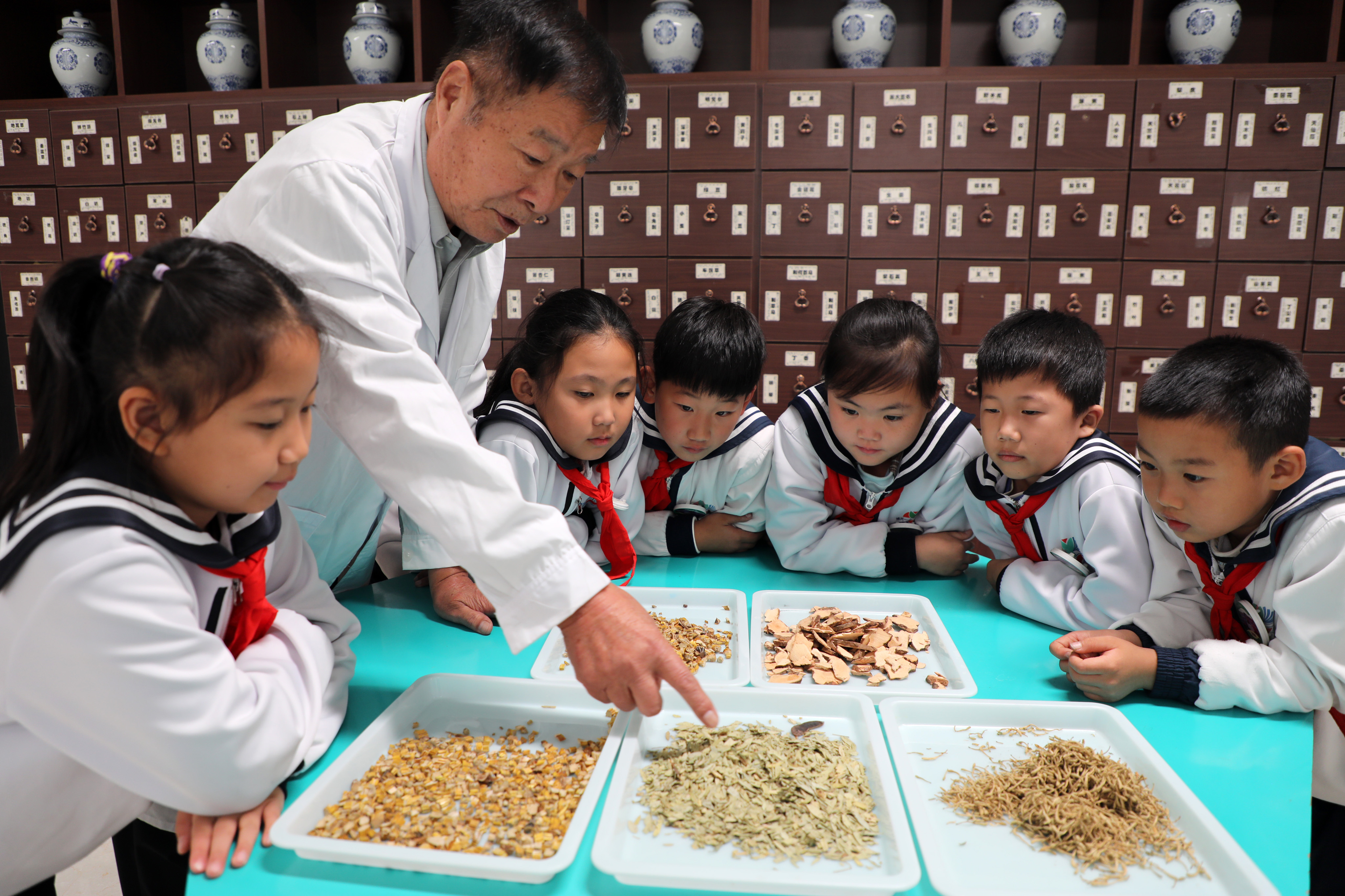 一名中醫(yī)醫(yī)師指導(dǎo)小學(xué)生學(xué)認(rèn)各種中草藥材。陳彬 攝