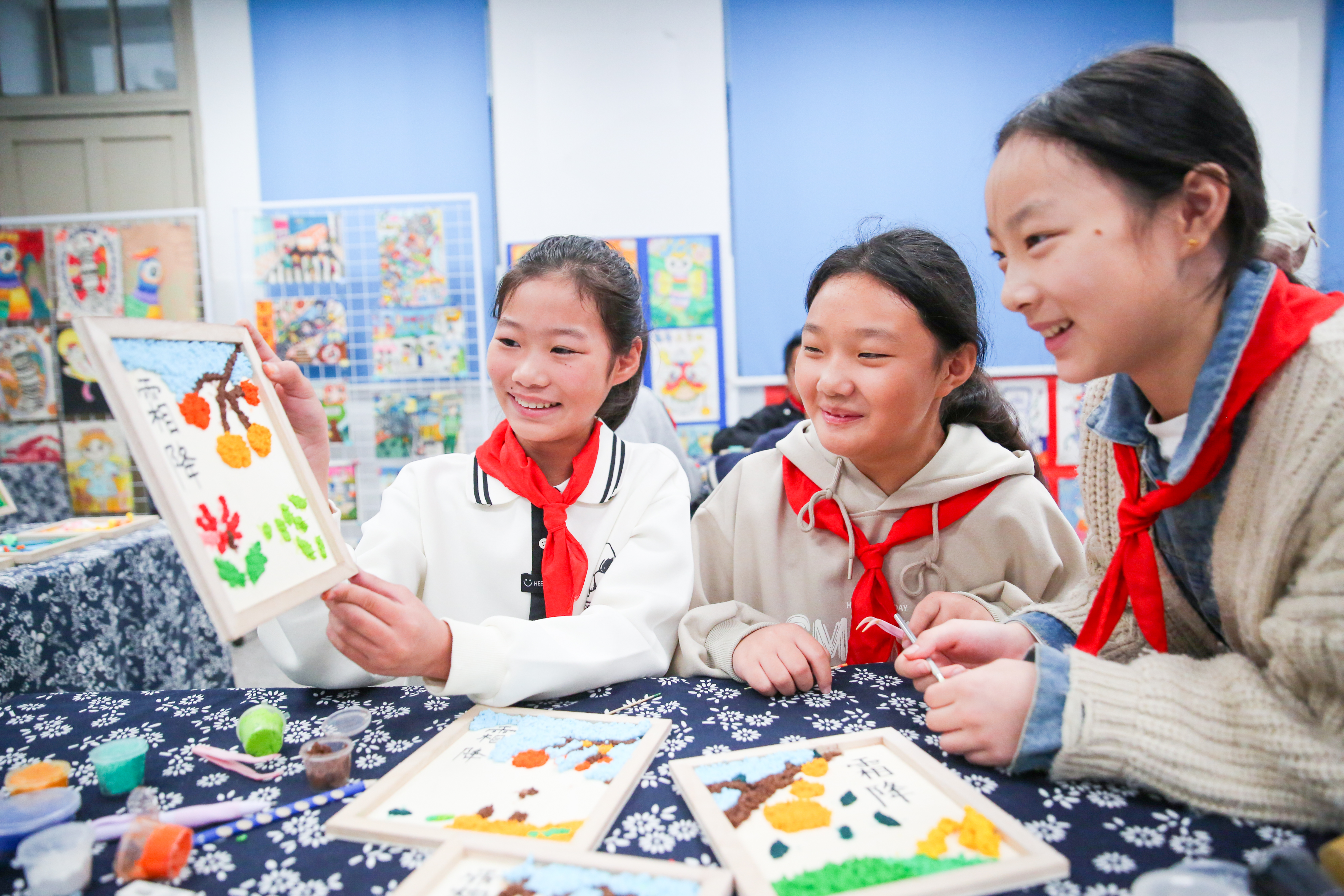 學(xué)生們相互展示制作的“霜降”節(jié)氣非遺紙漿畫作品。徐慧 攝