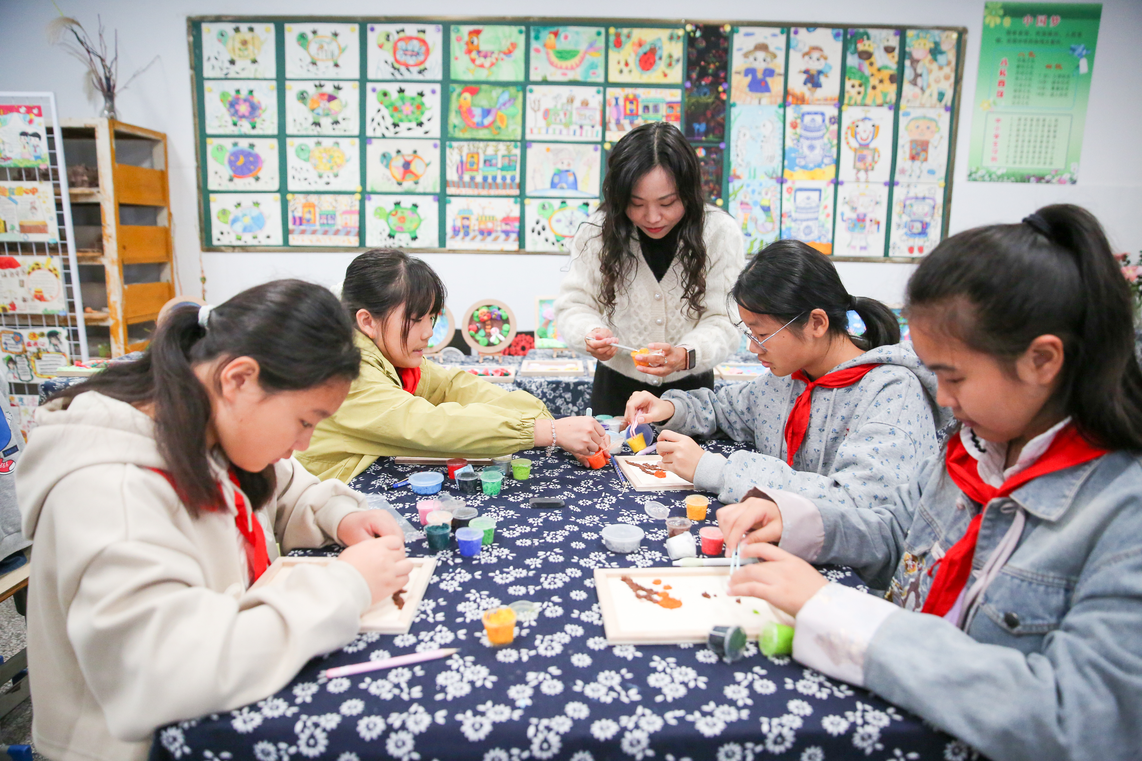 學(xué)生們在制作以“霜降”節(jié)氣民俗為內(nèi)容的手工非遺紙漿畫作品。徐慧 攝