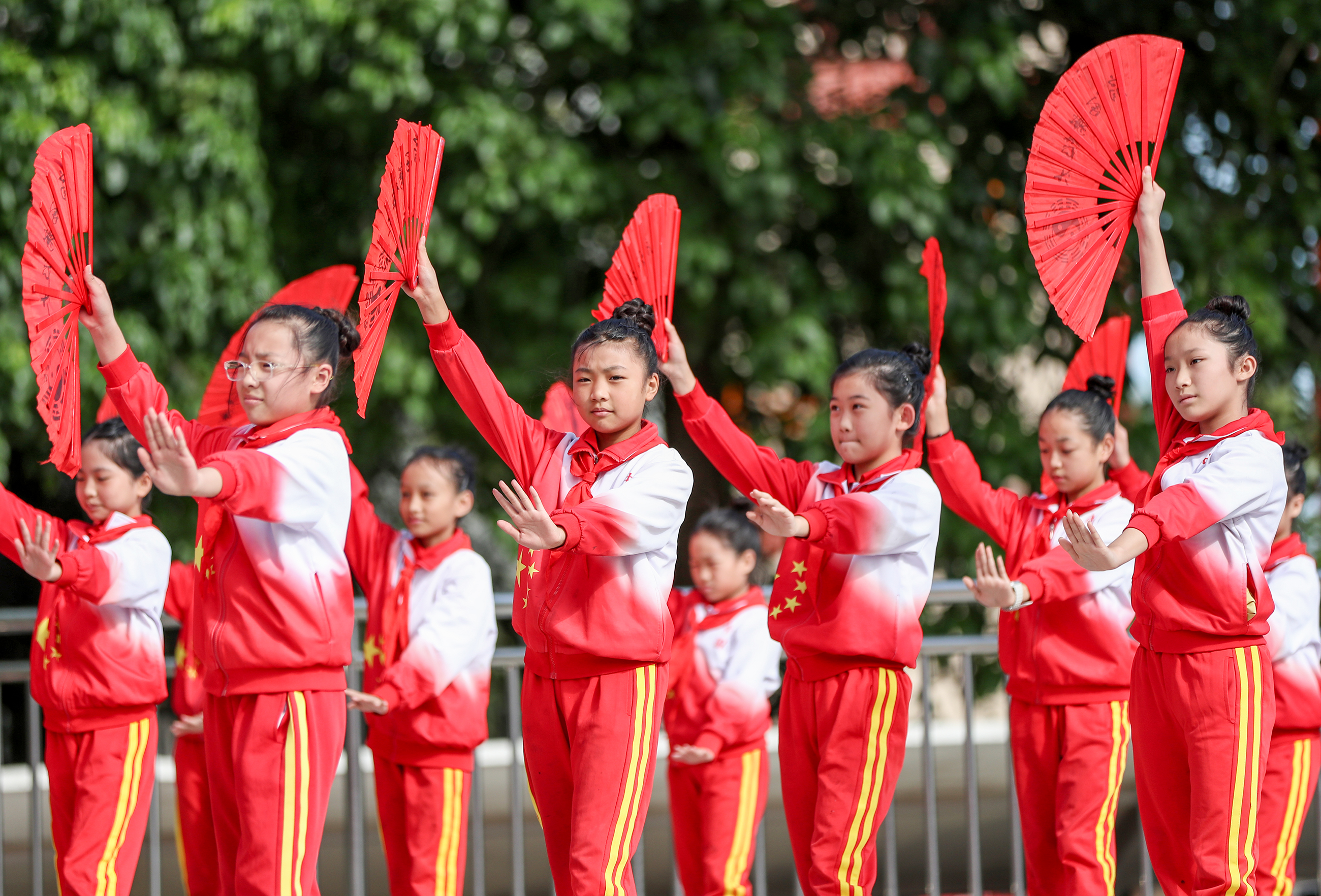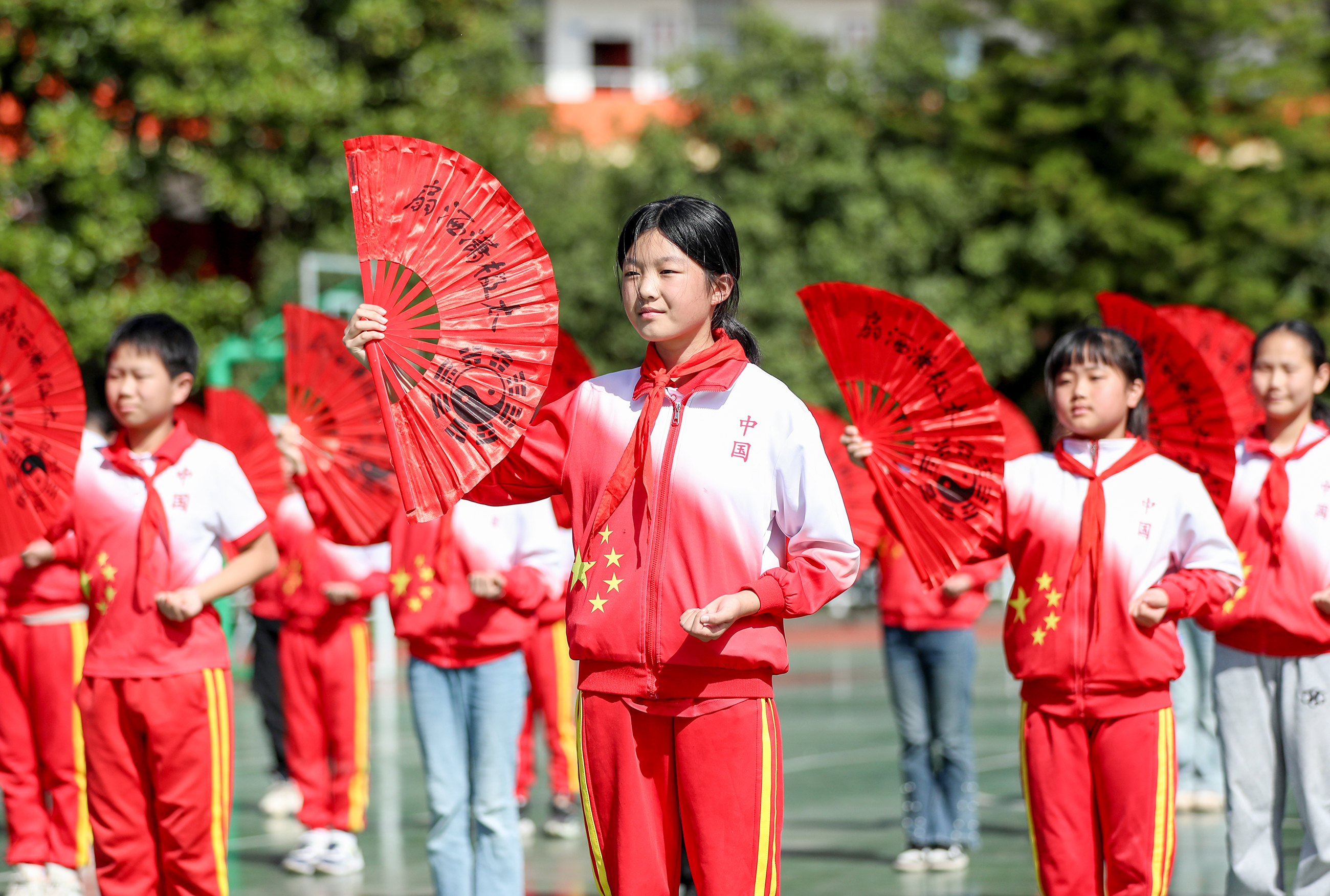 10月22日,四川省華鎣市祿市鎮(zhèn)占云小學(xué)小學(xué)學(xué)生分組展示特色武術(shù)“太極功夫扇”。邱海鷹 劉南賢 攝