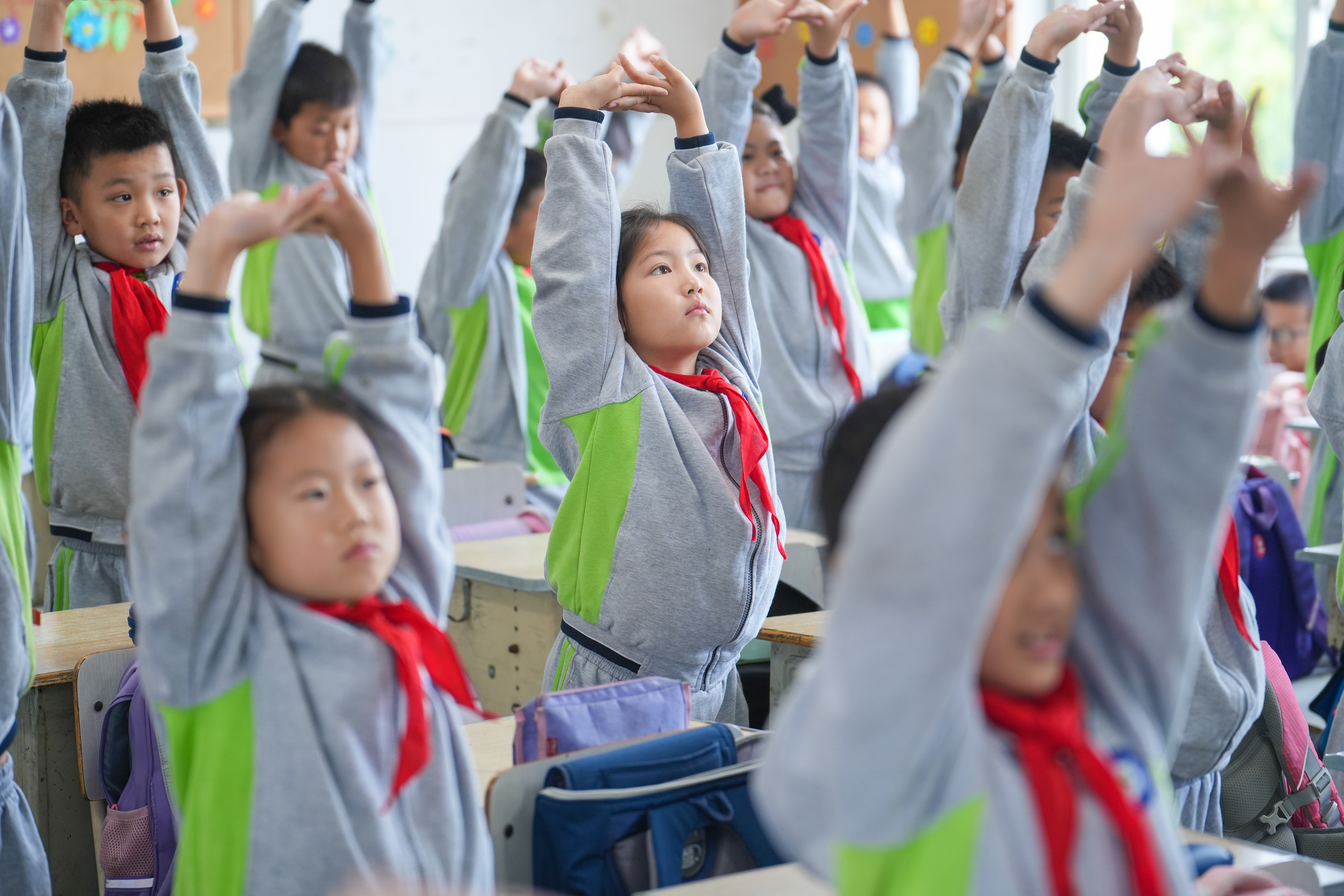 10月22日,浙江省湖州市德清縣鐘管小學(xué),學(xué)生在練習(xí)“八段錦”。王正 攝