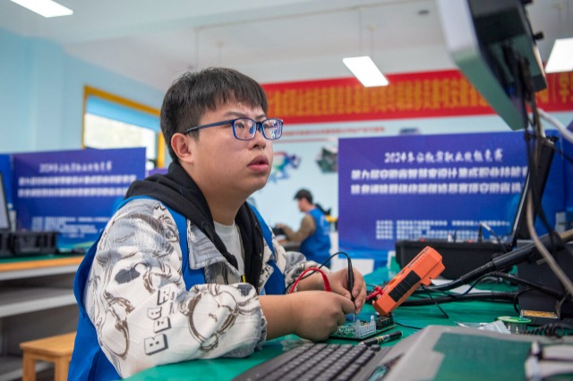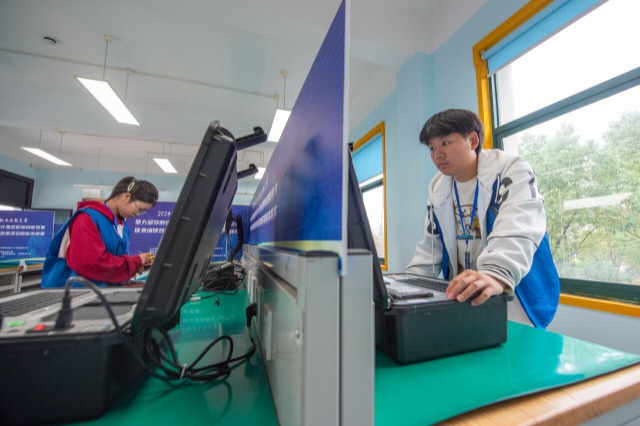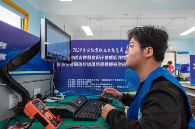 選手正在進(jìn)行信息通信網(wǎng)絡(luò)終端維修員賽項的比拼 肖本祥 攝