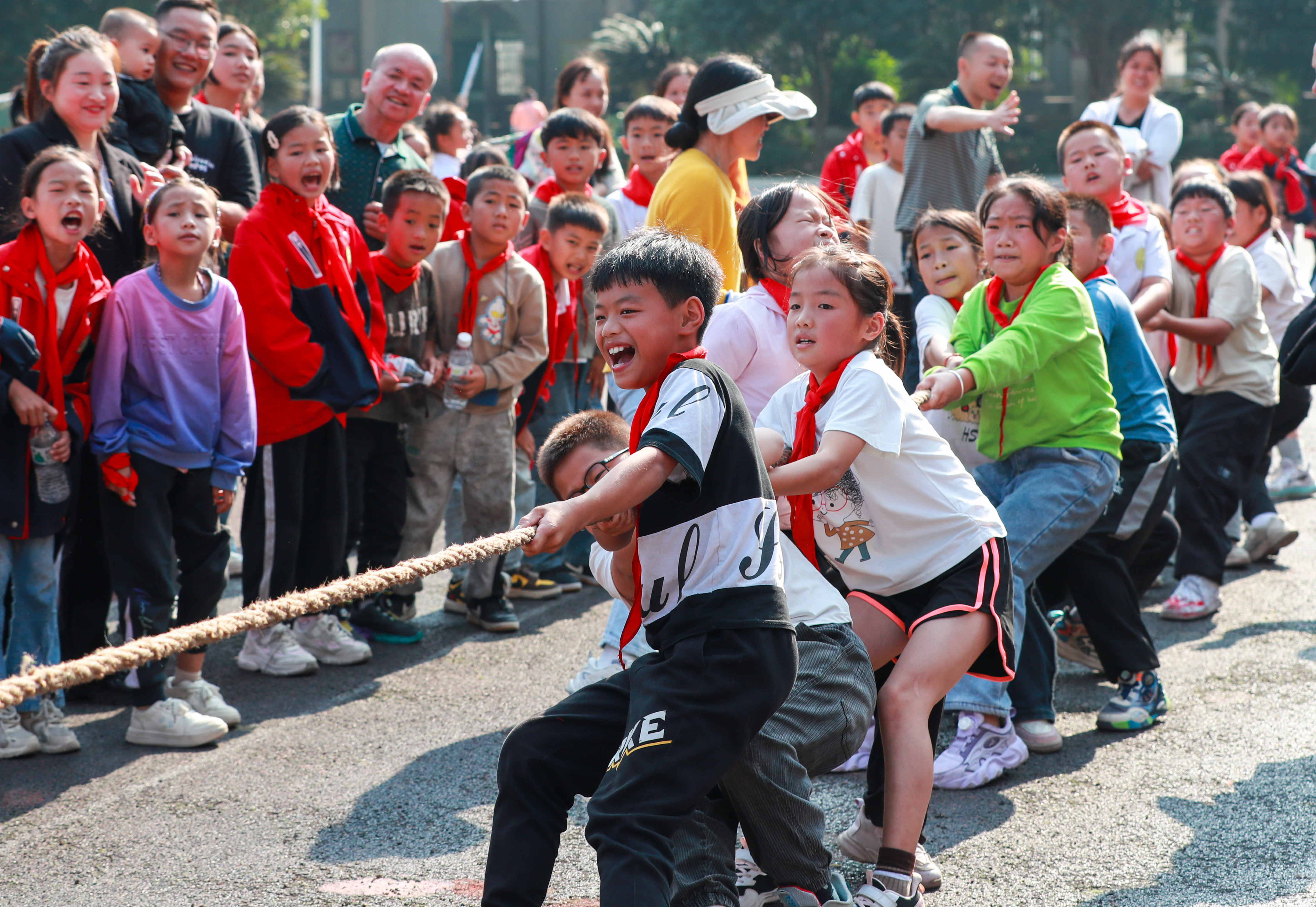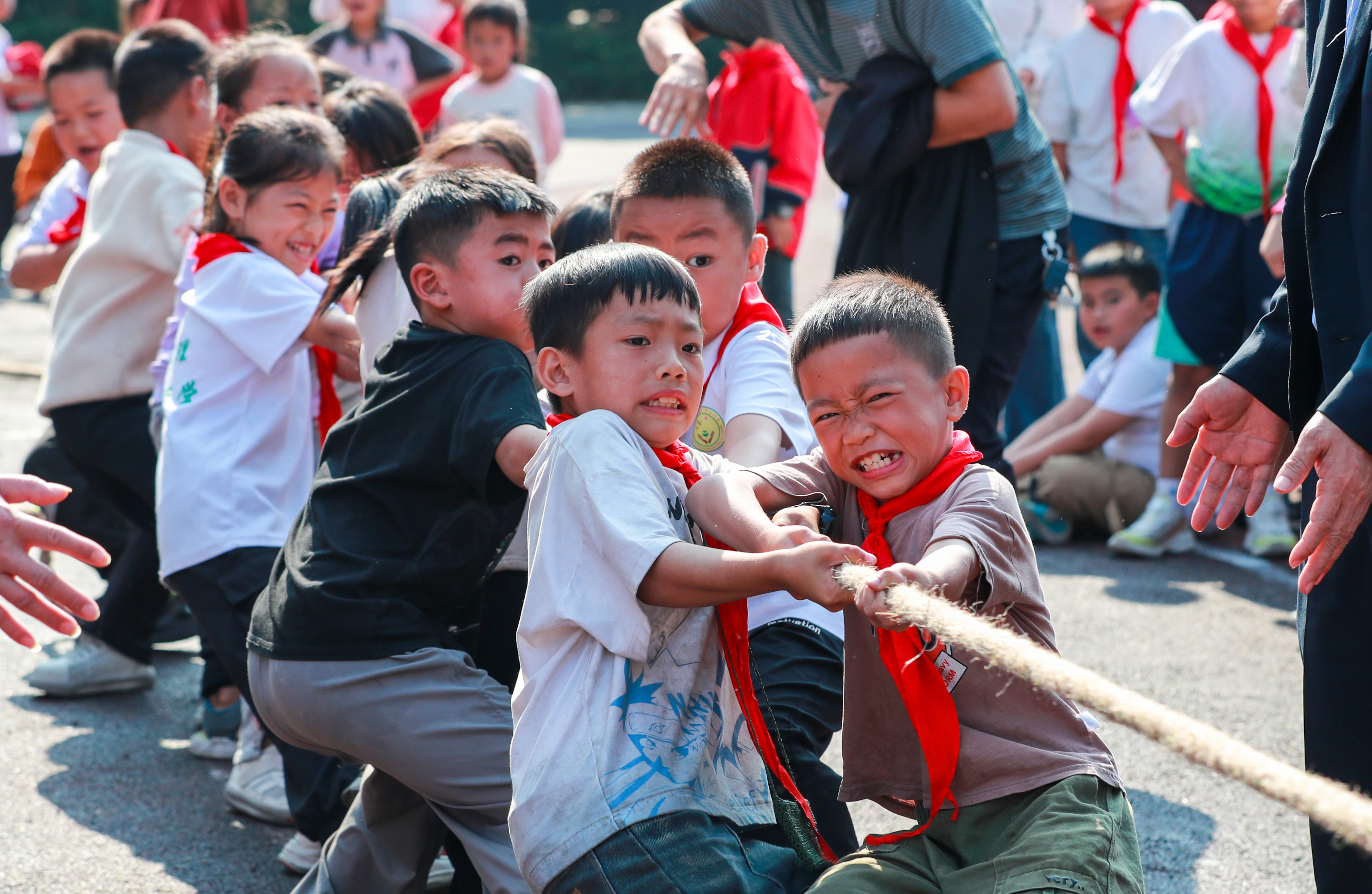 11月15日,貴州省黔東南苗族侗族自治州從江縣剛邊壯族鄉(xiāng)中心小學學生參加拔河比賽。入冬以來,該校充分利用大課間和課外活動時間開展多種體育活動,讓學生在快樂的體育運動中鍛煉身體、增強體質。(中國教育報-中國教育新聞網通訊員 羅京來 攝)