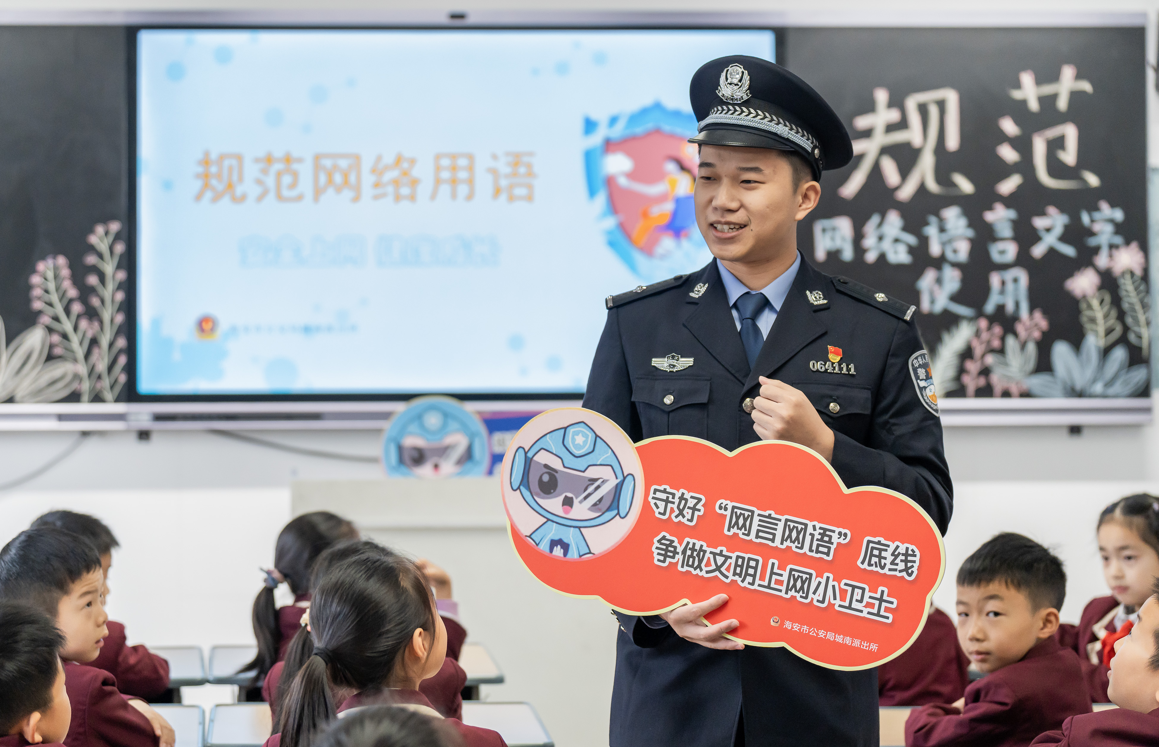 11月19日,江蘇省海安高新區(qū)實(shí)驗(yàn)小學(xué)與海安市公安局城南派出所聯(lián)合開展“清朗·規(guī)范網(wǎng)絡(luò)語(yǔ)言文字使用”主題宣傳活動(dòng)。民警通過(guò)互動(dòng)課堂、趣味游戲、發(fā)放倡議書等形式,向?qū)W生們講解不規(guī)范、不文明網(wǎng)絡(luò)用語(yǔ)的危害,引導(dǎo)學(xué)生們文明健康上網(wǎng),規(guī)范使用語(yǔ)言文字,傳播網(wǎng)絡(luò)正能量,當(dāng)好清朗有序網(wǎng)絡(luò)空間的“小衛(wèi)士”。(中國(guó)教育報(bào)-中國(guó)教育新聞網(wǎng)通訊員 翟偉凱 攝)