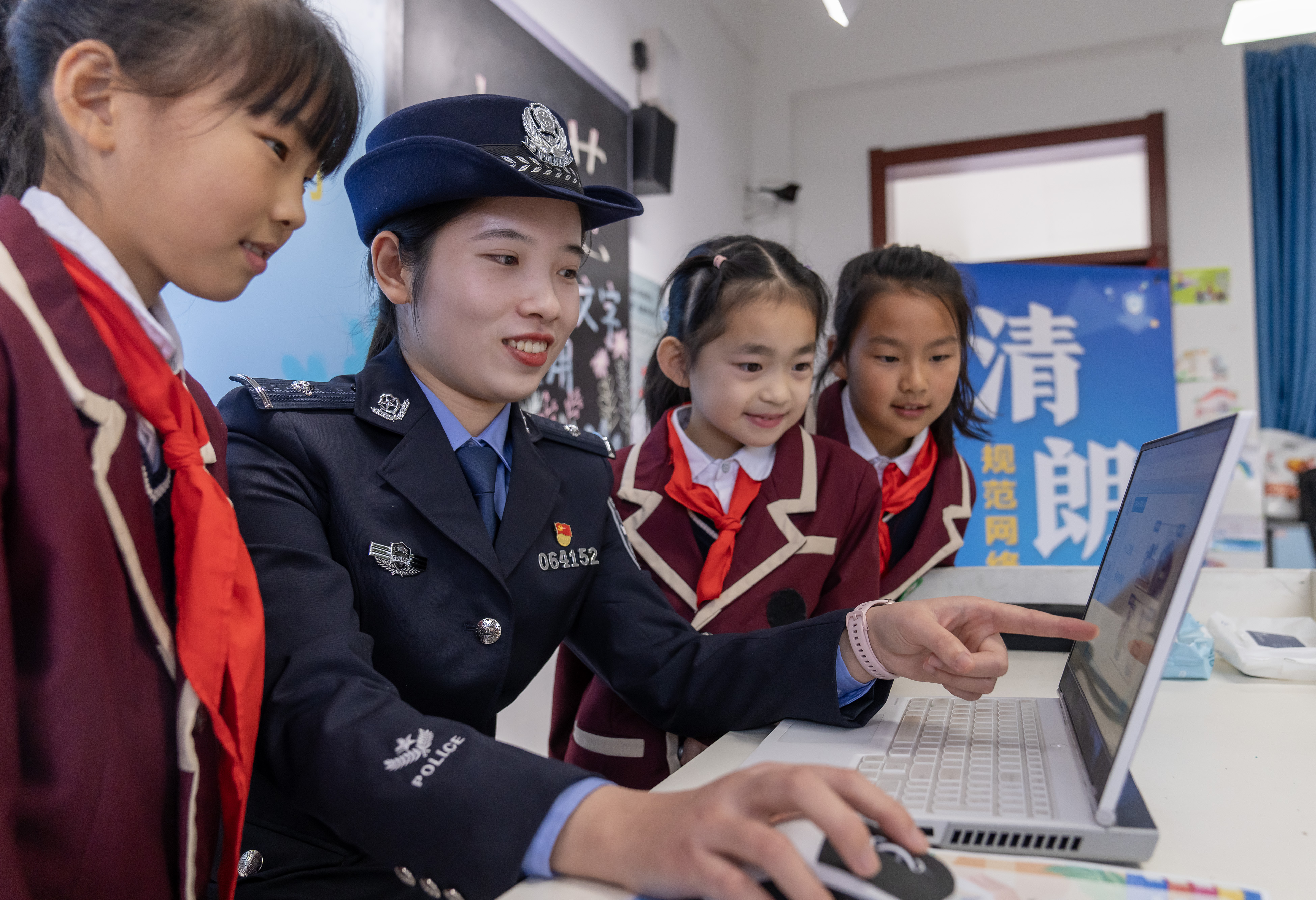 11月19日,民警對(duì)小學(xué)生開展“清朗·規(guī)范網(wǎng)絡(luò)語(yǔ)言文字使用”主題宣傳。翟偉凱 攝