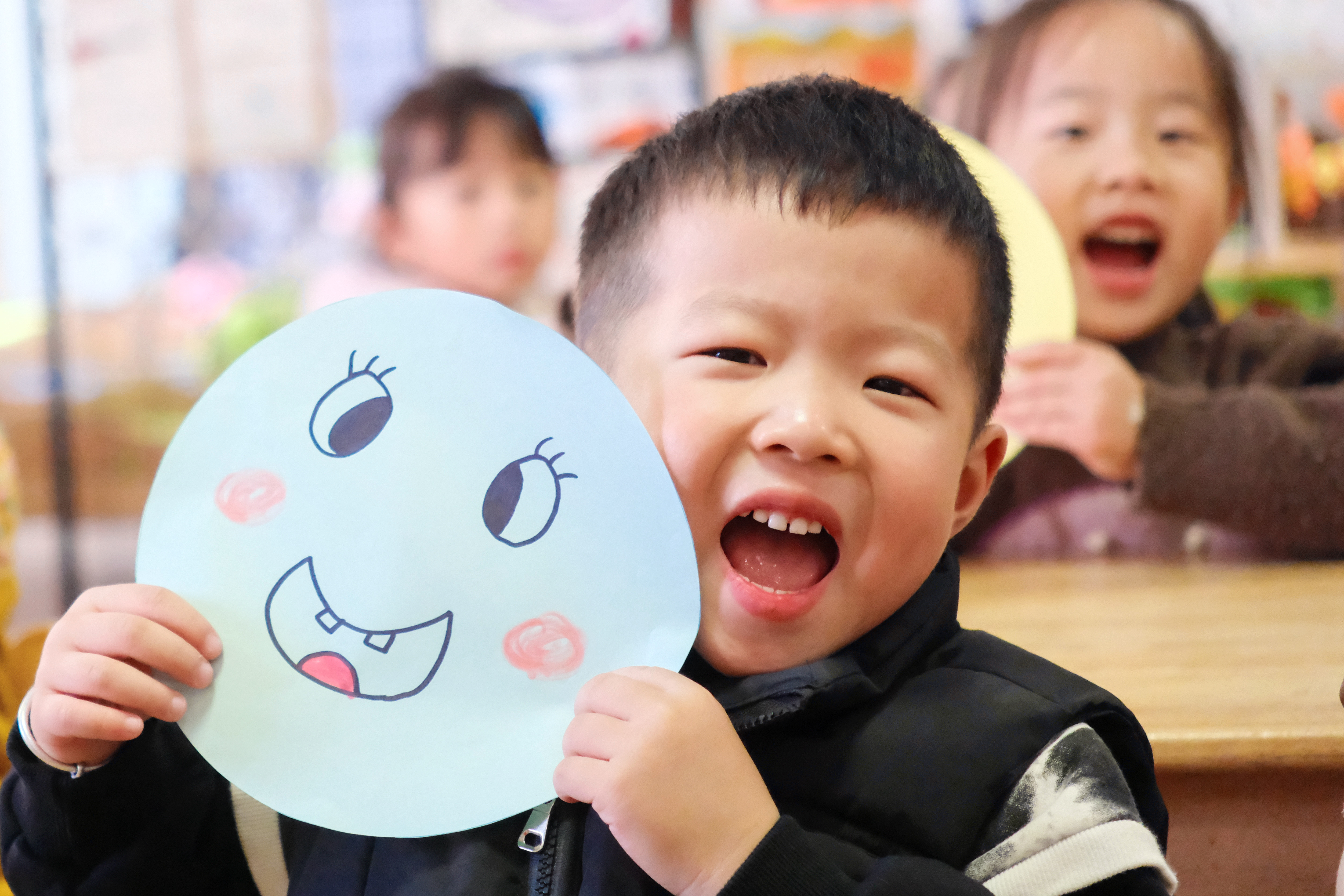 11月21日,孩子們展示笑臉問候卡。譚云俸 周佳麗 攝