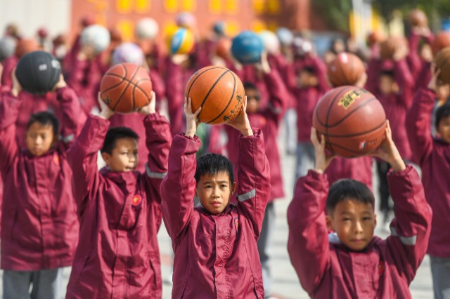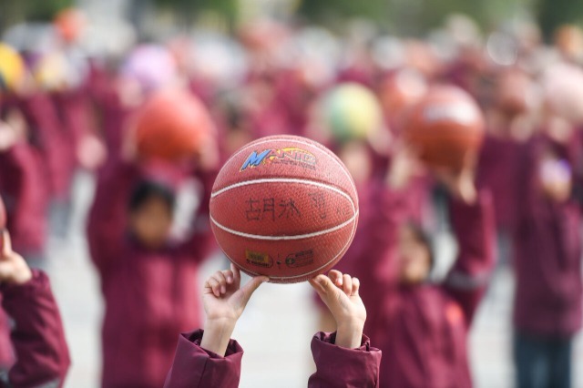 小學(xué)生在大課間做籃球操。通訊員 蔣克青 蔣憑姣 攝