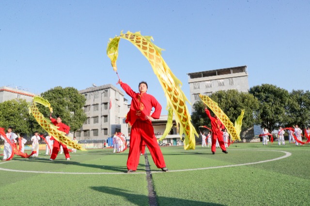 學(xué)生們在嫻熟地舞動(dòng)民間傳統(tǒng)運(yùn)動(dòng)彩帶龍。通訊員 劉貴雄?鄭軍?攝