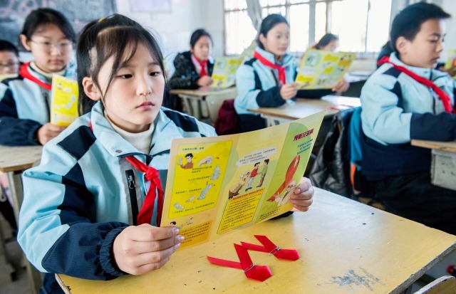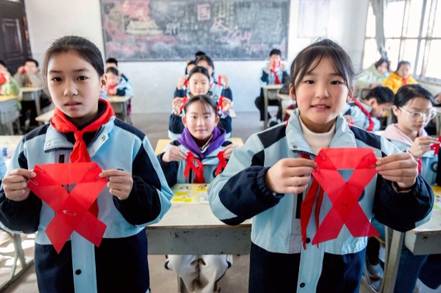 11月29日,安徽省含山縣姚廟中心學(xué)校開展“情系‘紅絲帶’關(guān)愛你我他”主題教育活動(dòng),小學(xué)生通過學(xué)習(xí)“防艾”知識、制作“紅絲帶”、展示“紅絲帶”等方式,迎接12月1日“世界艾滋病日”的到來。中國教育報(bào)-中國教育新聞網(wǎng)通訊員 歐宗濤 攝