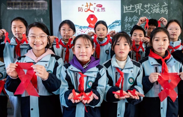 學(xué)生展示“紅絲帶”。通訊員 歐宗濤 攝
