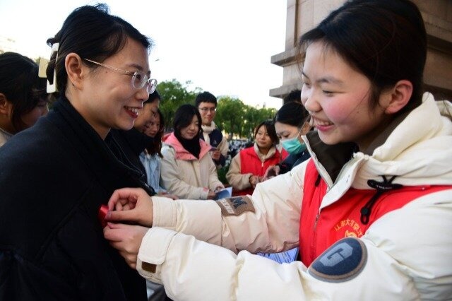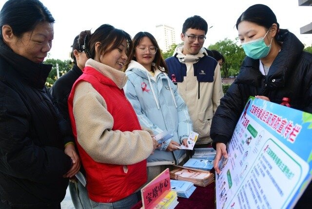 11月29日,在江蘇省鎮(zhèn)江市金星社區(qū),江蘇大學京江學院志愿者向居民宣講艾滋病防范知識。當日,鎮(zhèn)江市七里甸街道金星社區(qū)聯(lián)合寶塔路社區(qū)衛(wèi)生服務(wù)中心和江蘇大學京江學院志愿者開展“防艾宣傳社區(qū)行”活動,向居民宣講艾滋病防范知識,倡導健康文明生活方式,呼吁全社會共同遏制艾滋,迎接世界艾滋病日的到來。2024年世界艾滋病日主題是“社會共治,終結(jié)艾滋,共享健康”。中國教育報-中國教育新聞網(wǎng)通訊員 石玉成 攝