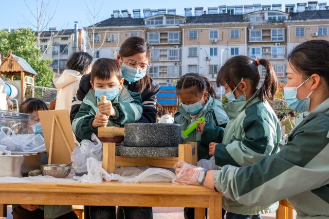 家長在指導孩子磨芝麻粉。通訊員 肖本祥 攝
