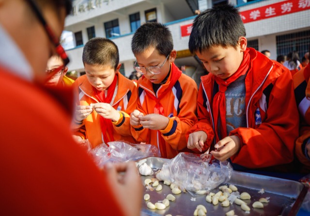 學生在進行剝大蒜子比賽 胡賢兵 孫秋月 攝