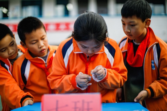學生在進行穿針引線比賽 胡賢兵 孫秋月 攝