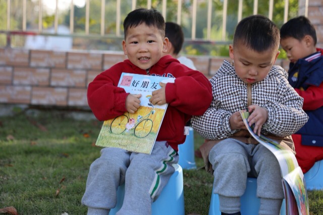 孩子們在初冬的陽光下享受閱讀帶來的快樂 陳霞芳 攝