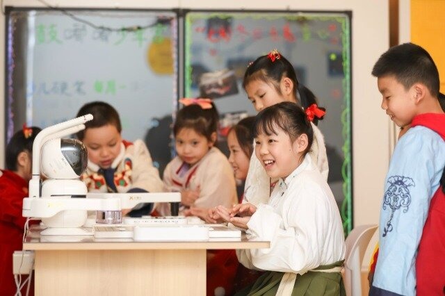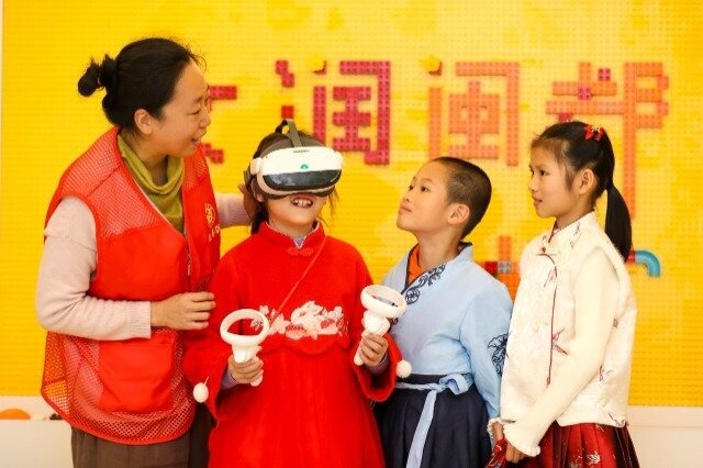 志愿者正在指導(dǎo)小朋友使用AR眼鏡 謝貴明 攝