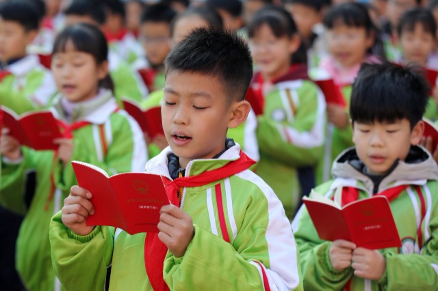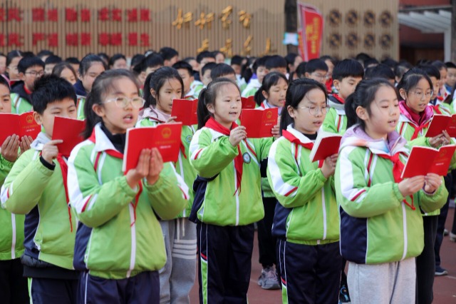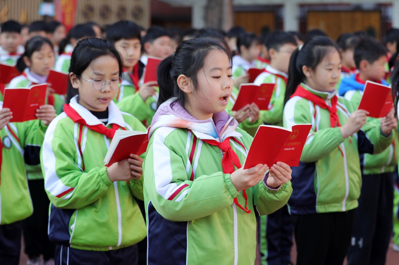 2024年12月3日,安徽省淮北市第三實驗小學的學生們在校園里進行憲法晨讀。當日,在第十一個國家憲法日到來之際,安徽省淮北市第三實驗小學組織學生開展憲法晨讀活動,學生們齊聲誦讀憲法部分章節(jié)、條款,學習憲法內(nèi)涵,維護憲法權威,弘揚憲法精神。(中國教育報-中國教育新聞網(wǎng) 通訊員 萬善朝 攝)