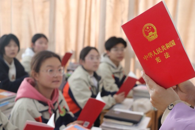 國家憲法日來臨之際,山東省高密市第五中學(xué)組織開展“學(xué)憲法、講憲法”主題教育,通過晨讀憲法、思政課上講憲法、憲法宣誓等多種形式,幫助中學(xué)生堅定社會主義理想信念,樹立忠于憲法、遵守憲法、維護憲法的法治意識。(中國教育報-中國教育新聞網(wǎng) 通訊員 李海濤 攝)