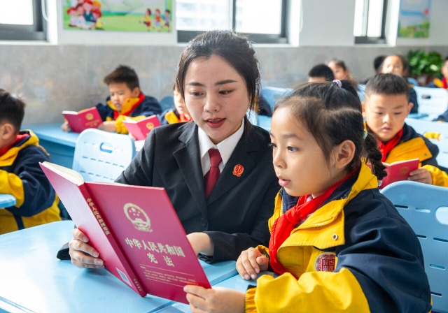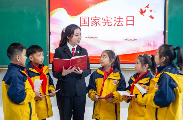 在“國家憲法日”到來之際,江蘇省南通市通州區(qū)人民法院與通州區(qū)古沙小學聯(lián)合開展“憲法知識進課堂”活動,活動通過誦讀憲法、認識國徽、互動問答等形式,讓孩子們學習憲法知識,增強法治觀念,弘揚憲法精神。圖為2024年12月3日,江蘇省南通市通州區(qū)人民法院的法官在古沙小學給小學生講解憲法知識。(中國教育報-中國教育新聞網(wǎng) 通訊員 翟慧勇 攝)
