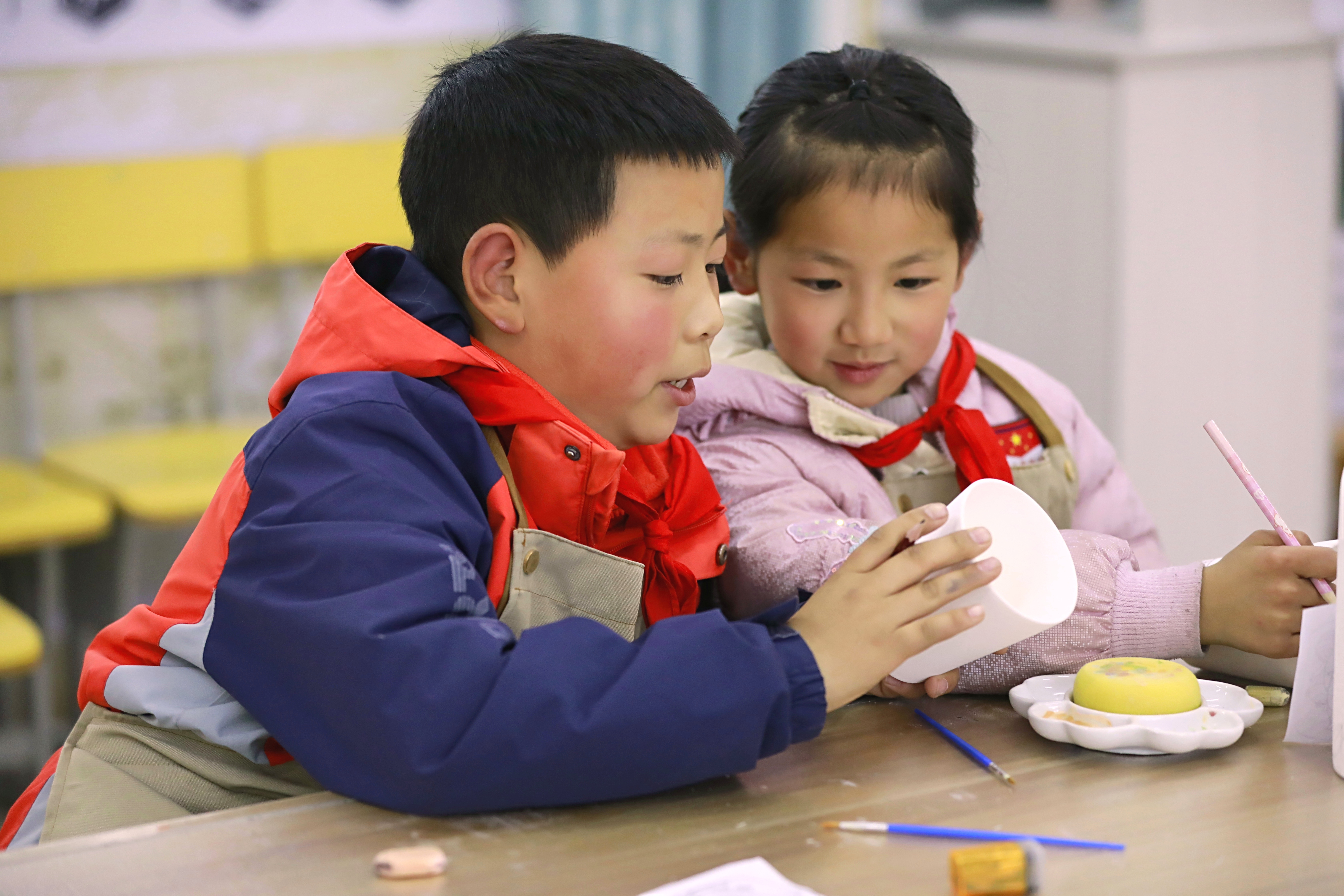 湖北省竹山縣寶豐鎮(zhèn)紅衛(wèi)小學(xué)陶藝工作坊里學(xué)習(xí)制淘、彩繪等技能。通訊員 朱本雙 熊兵 攝