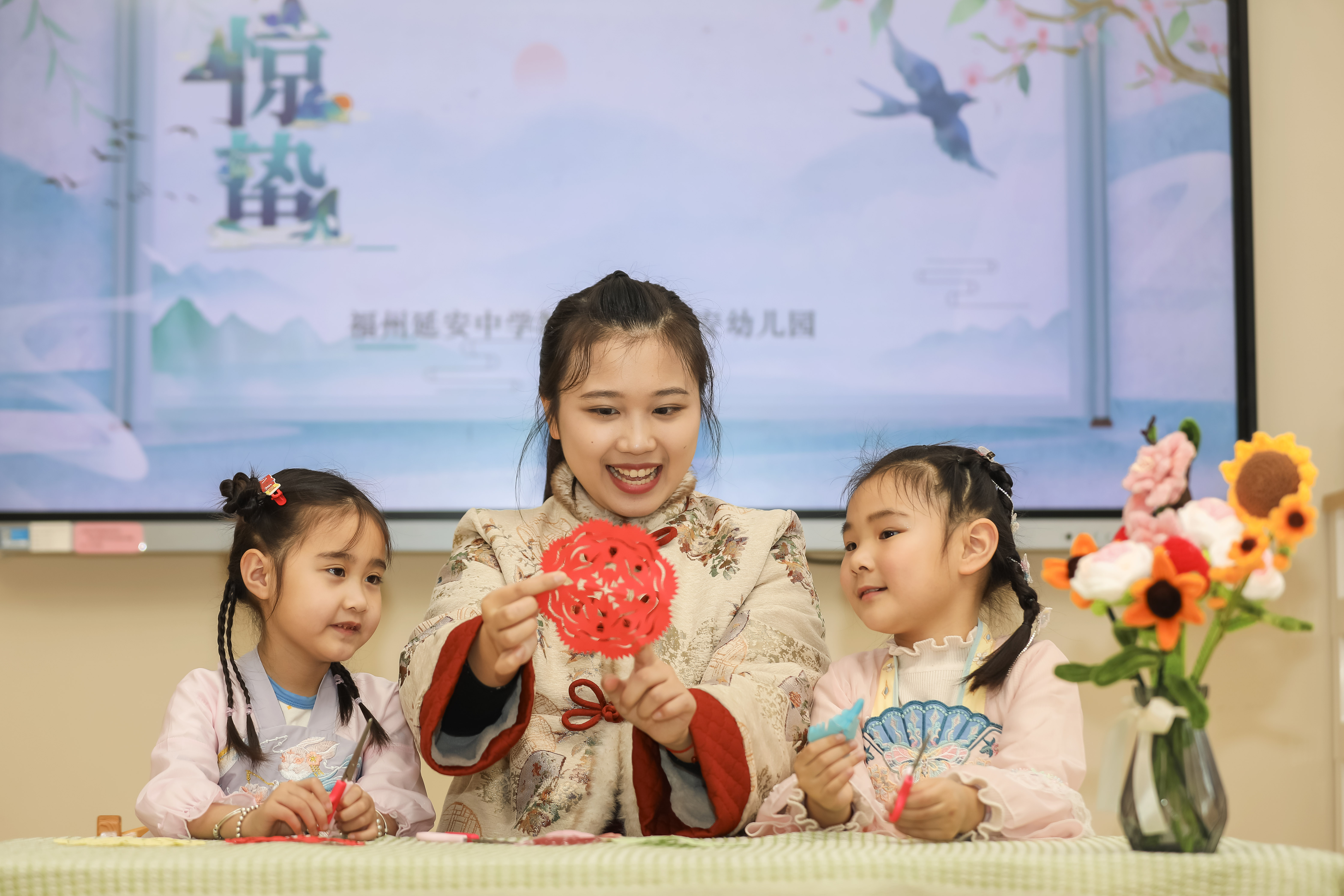 福建省福州市鼓樓區(qū)水部街道延安幼兒園,老師正在指導(dǎo)孩子進(jìn)行驚蟄節(jié)氣剪紙。通訊員 謝貴明 攝
