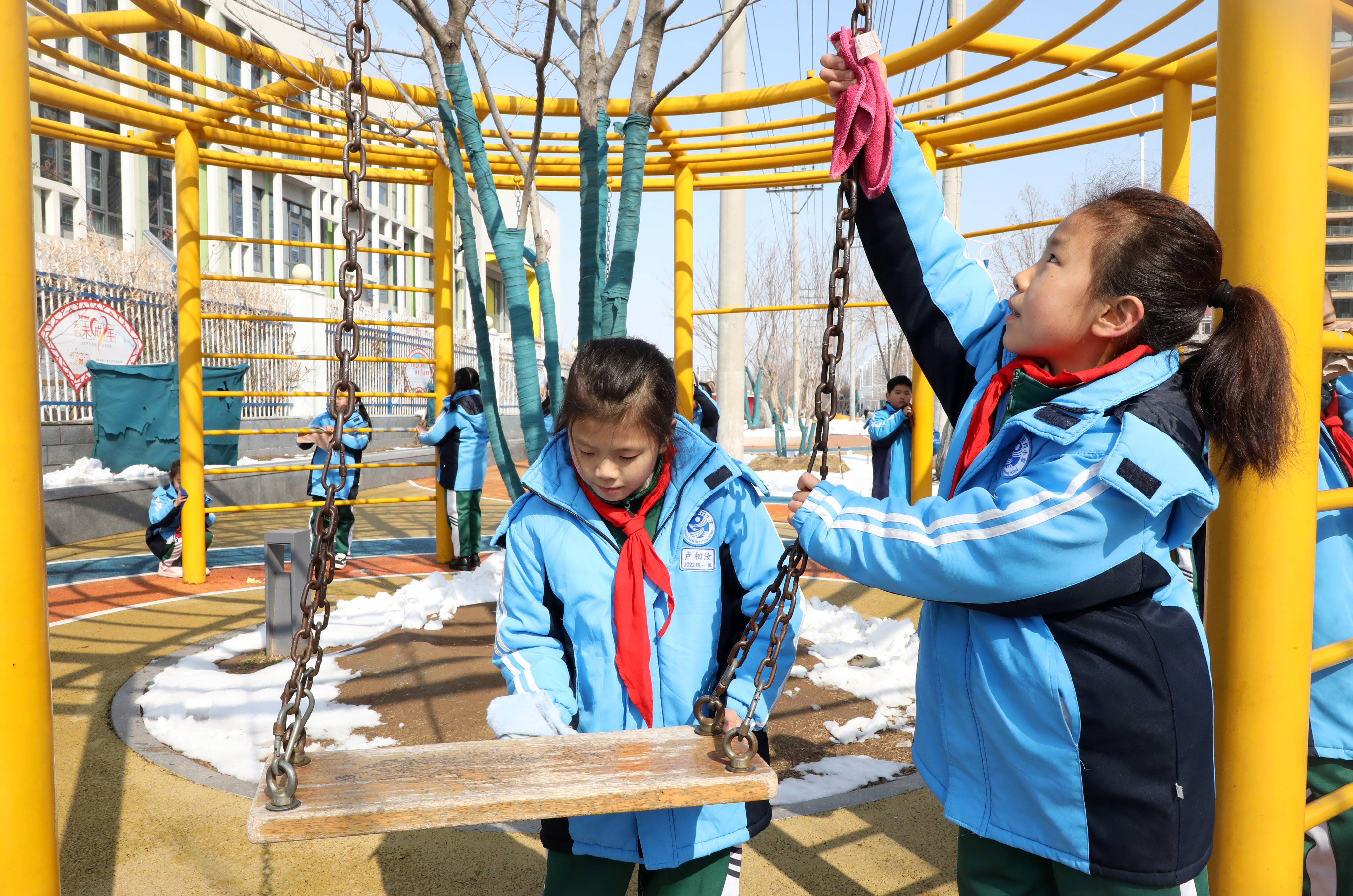 在山東省濱州市博興縣城區(qū)的一處“口袋公園”,博興縣第四小學(xué)的學(xué)生在擦拭清潔健身器材。通訊員 陳彬 攝