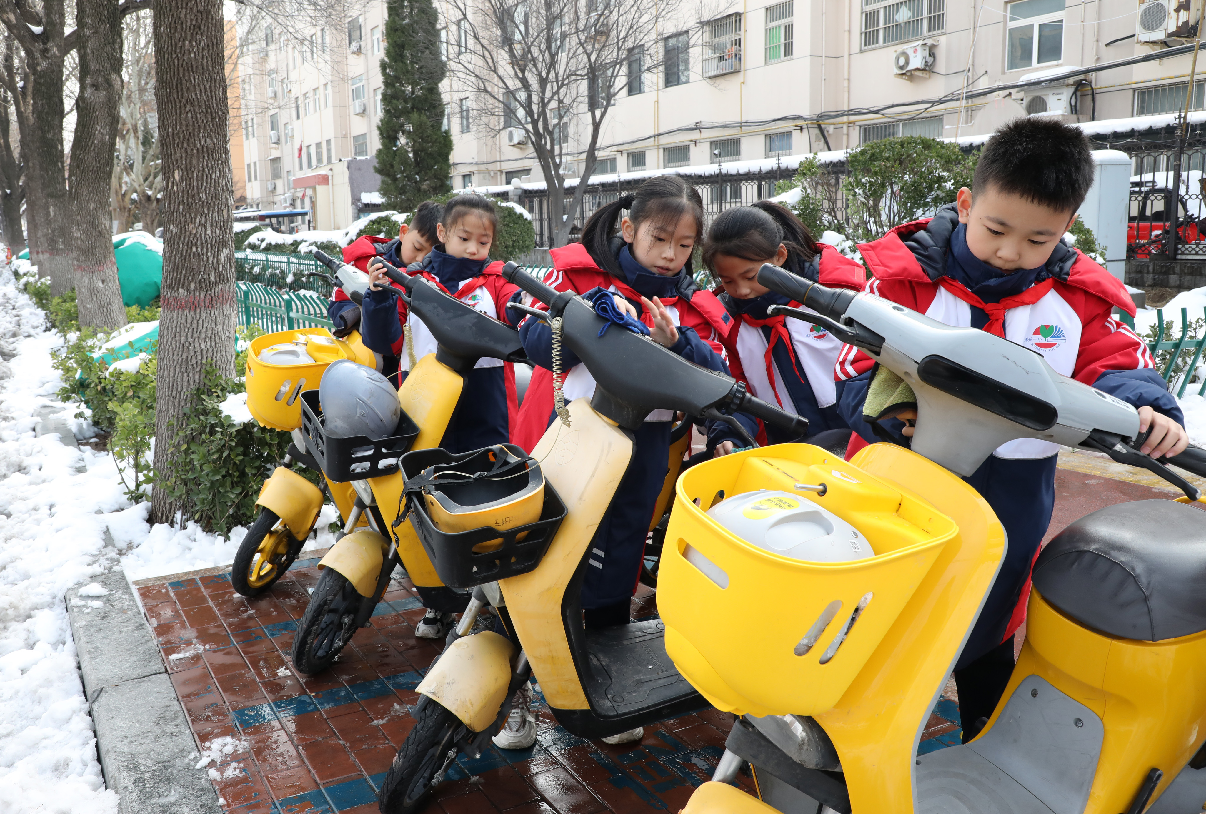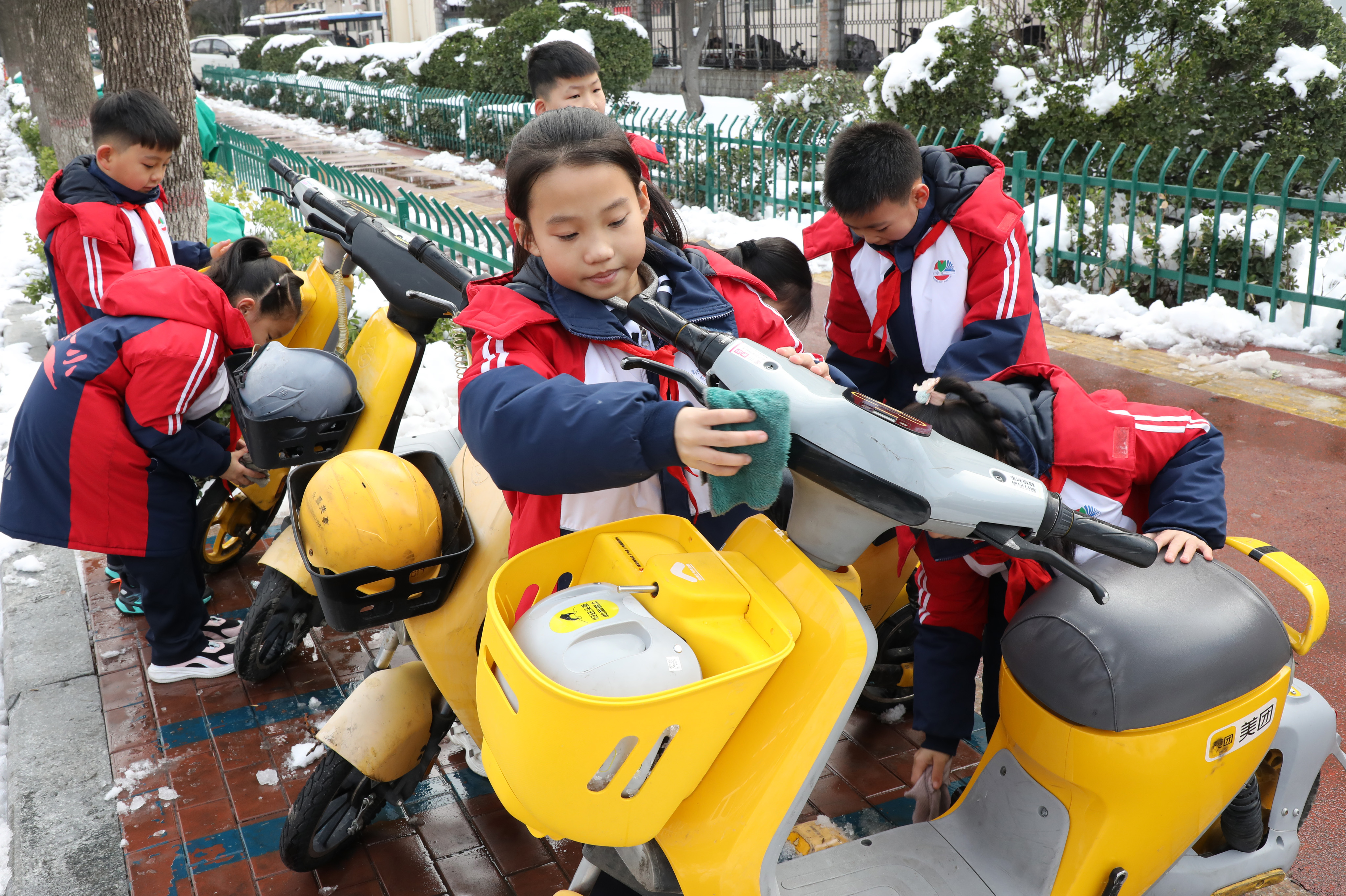 在山東省濱州市博興縣城區(qū)的一處共享電動(dòng)車(chē)停放點(diǎn),博興縣第一小學(xué)的學(xué)生在擦拭清潔共享電動(dòng)車(chē)。通訊員 陳彬 攝