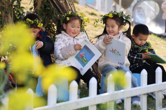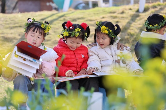 小朋友在春花燦漫中看書。通訊員 陳霞芳 攝