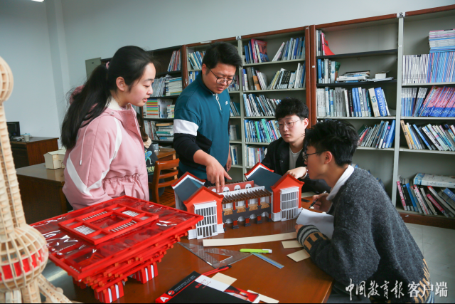 中共二大會址在網(wǎng)絡上沒有公開的數(shù)字模型資料,同學們通過實地考察和測繪數(shù)據(jù),用無人機拍攝獲取建筑物全景。為了讓模型更真切,讓歷史更鮮活,同學們在中共四大紀念館的制作中采用了最傳統(tǒng)的手繪技術,在建筑模型上一磚一瓦地繪出青瓦墻面、紅瓦屋頂、穿中山裝的行人、黨旗國旗,每一個細節(jié)展現(xiàn)的都是同學們對歷史的尊重和對黨的敬愛。“通過沉浸式的專業(yè)實踐,我們真實‘觸摸’到黨的奮斗歷程和豐功偉績;通過有溫度的作品,我們真情述說著對黨的深情和作為青年一代的赤子初心?!毖芯可h員蔡華喬同學動情地說。