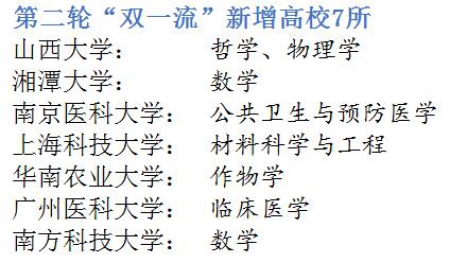 中國教育報-中國教育新聞網(wǎng)北京2月14日訊(記者 唐琪)記者今天從教育部獲悉,第二輪“雙一流”建設(shè)高校及建設(shè)學(xué)科名單公布,共有建設(shè)高校147所。其中,山西大學(xué)、湘潭大學(xué)、南京醫(yī)科大學(xué)、上??萍即髮W(xué)、華南農(nóng)業(yè)大學(xué)、廣州醫(yī)科大學(xué)、南方科技大學(xué)等7所高校的8個專業(yè)新增入選第二輪“雙一流”建設(shè)高校及建設(shè)學(xué)科名單。