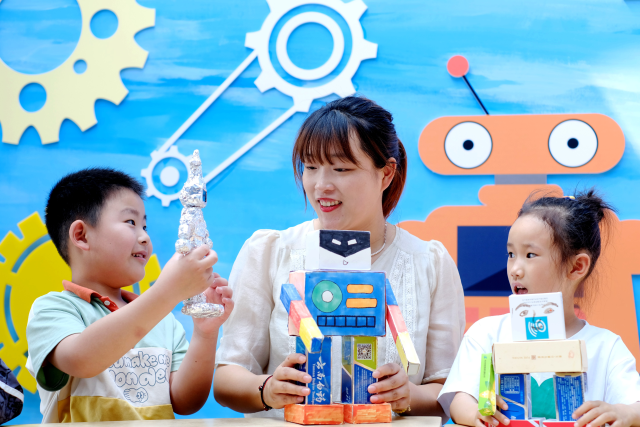 6月15日,浙江省湖州市長(zhǎng)興縣水口鄉(xiāng)中心幼兒園開展“倡導(dǎo)環(huán)保 樂享科技”手工制作活動(dòng)。老師指導(dǎo)小朋友們合理利用易拉罐、牙膏盒、舊玩具等廢舊物品制作科技環(huán)保作品,讓小朋友們從小樹立“愛科學(xué),愛創(chuàng)造,愛環(huán)保”的理念。許斌華 攝