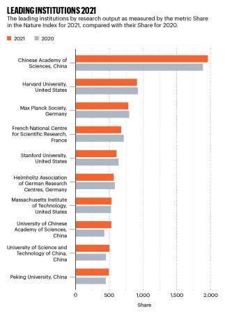 中國(guó)科學(xué)院在自然指數(shù)中繼續(xù)居于機(jī)構(gòu)榜單之首,其份額是排名第二的哈佛大學(xué)的兩倍多。根據(jù)此前發(fā)布的自然指數(shù)數(shù)據(jù),中科院已連續(xù)10年位列該排行榜全球第一。