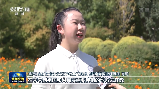 北京師范大學漢語言文學專業(yè)“優(yōu)師計劃”定向就業(yè)師范生 肖珂:總書記勉勵我們增長傳道授業(yè)解惑本領,在未來到祖國和人民最需要我們的地方去任教。我定不負囑托,努力學習,在畢業(yè)后回到我的家鄉(xiāng)。