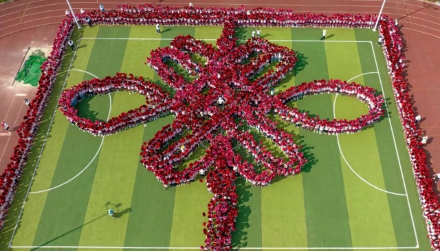 9月9日,湖南省懷化市通道侗族自治縣禮雅小學(xué),師生在操場中央織成一個(gè)火紅的中國結(jié)圖案。粟勇主 攝