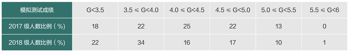 表2:2017、2018級中加合作辦學(xué)項目學(xué)生入學(xué)考試成績分布