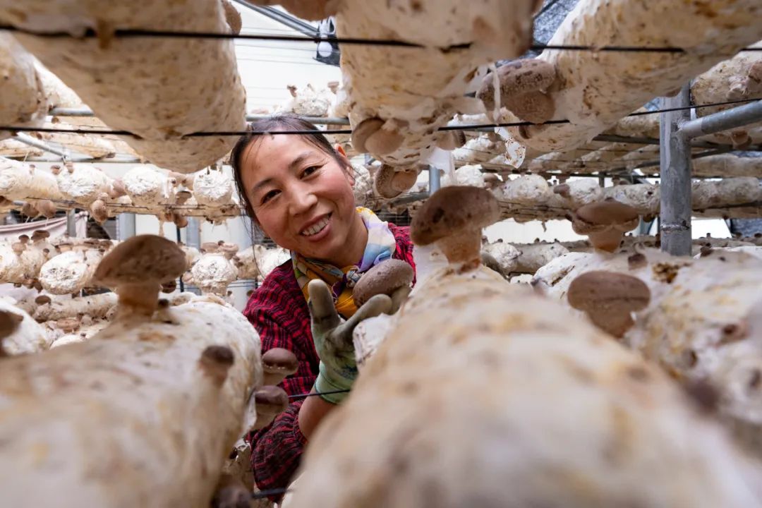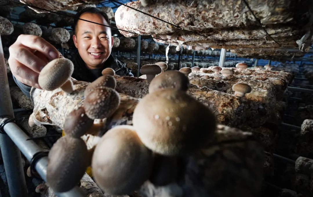 車(chē)道村菇農(nóng)王楊在食用菌大棚里查看香菇長(zhǎng)勢(shì)。人民日?qǐng)?bào)記者 李舸 攝