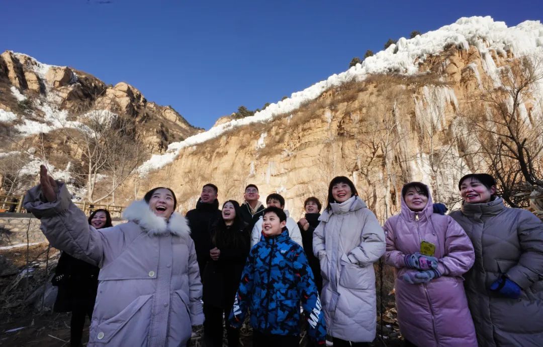 冬日清晨,河北阜平縣龍泉關(guān)鎮(zhèn)駱駝灣村迎來(lái)日出,村民在為游客講解太行山獨(dú)特的“日照冰瀑”景觀。人民日?qǐng)?bào)記者 李舸 攝
