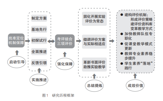 制定研究歷程框架。制定試行方案,選取3所不同層次的學(xué)校作為基地校先行。評(píng)價(jià)方式的優(yōu)化主要從“過(guò)程性評(píng)價(jià)”“學(xué)生操作評(píng)價(jià)”“書(shū)面測(cè)試評(píng)價(jià)”三個(gè)維度展開(kāi),每個(gè)維度間相輔相成共同助推教學(xué)方式變革。研究歷程框架如圖1。