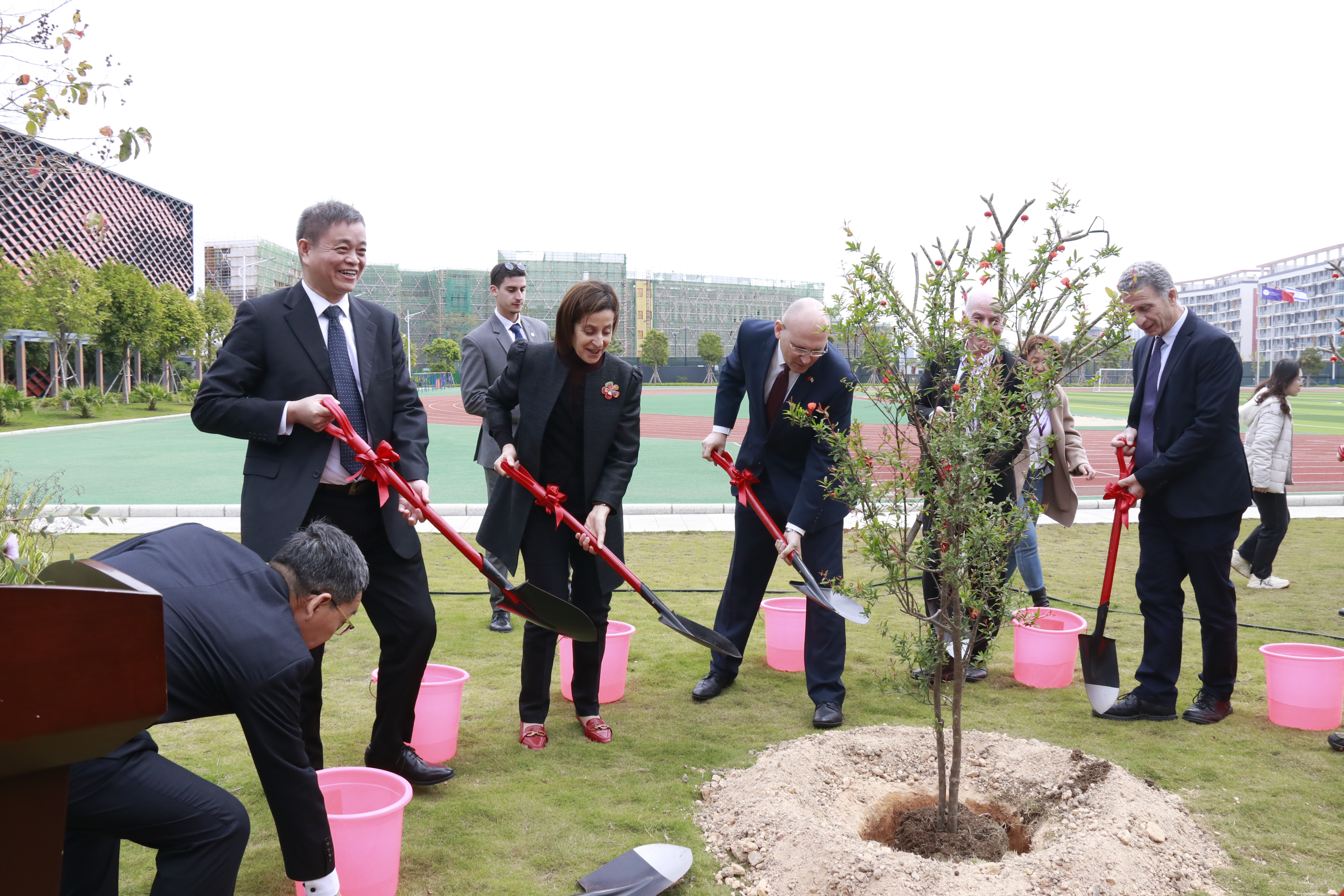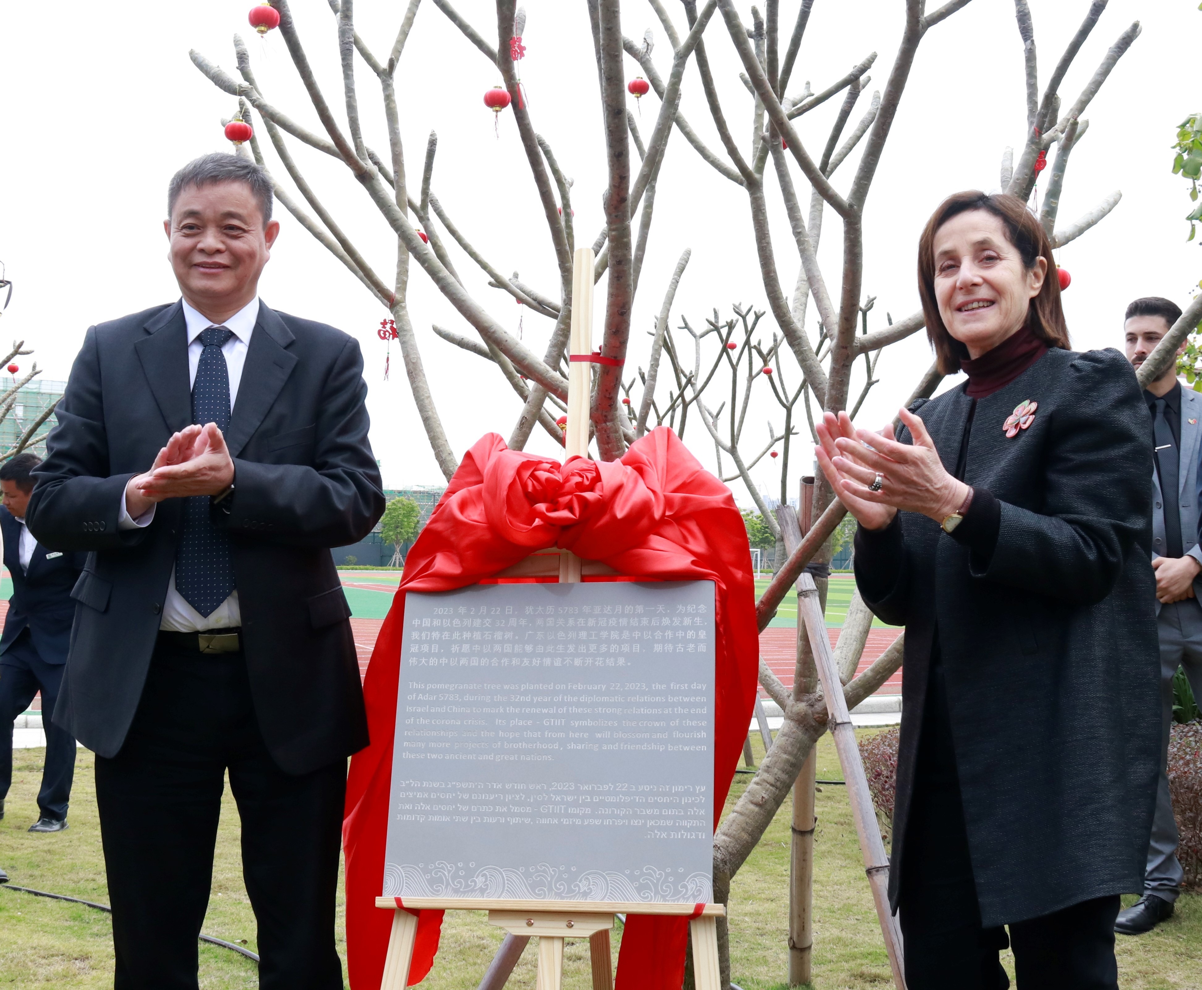 中國(guó)教育新聞網(wǎng)訊(記者 焦小新)2月21日至22日,以色列駐華大使潘綺瑞和以色列駐廣州總領(lǐng)事高文一行訪問廣東以色列理工學(xué)院(以下簡(jiǎn)稱“廣以”)。2月22日上午,在廣以南校區(qū),嘉賓一行與廣以校長(zhǎng)、中國(guó)科學(xué)院院士龔新高,常務(wù)副校長(zhǎng)David Gershoni等校領(lǐng)導(dǎo)共同種下一棵石榴樹。大家希望在生機(jī)勃勃的春日里,這棵友誼之樹、教育之樹在兩國(guó)美好情誼的共同澆灌下茁壯成長(zhǎng)。