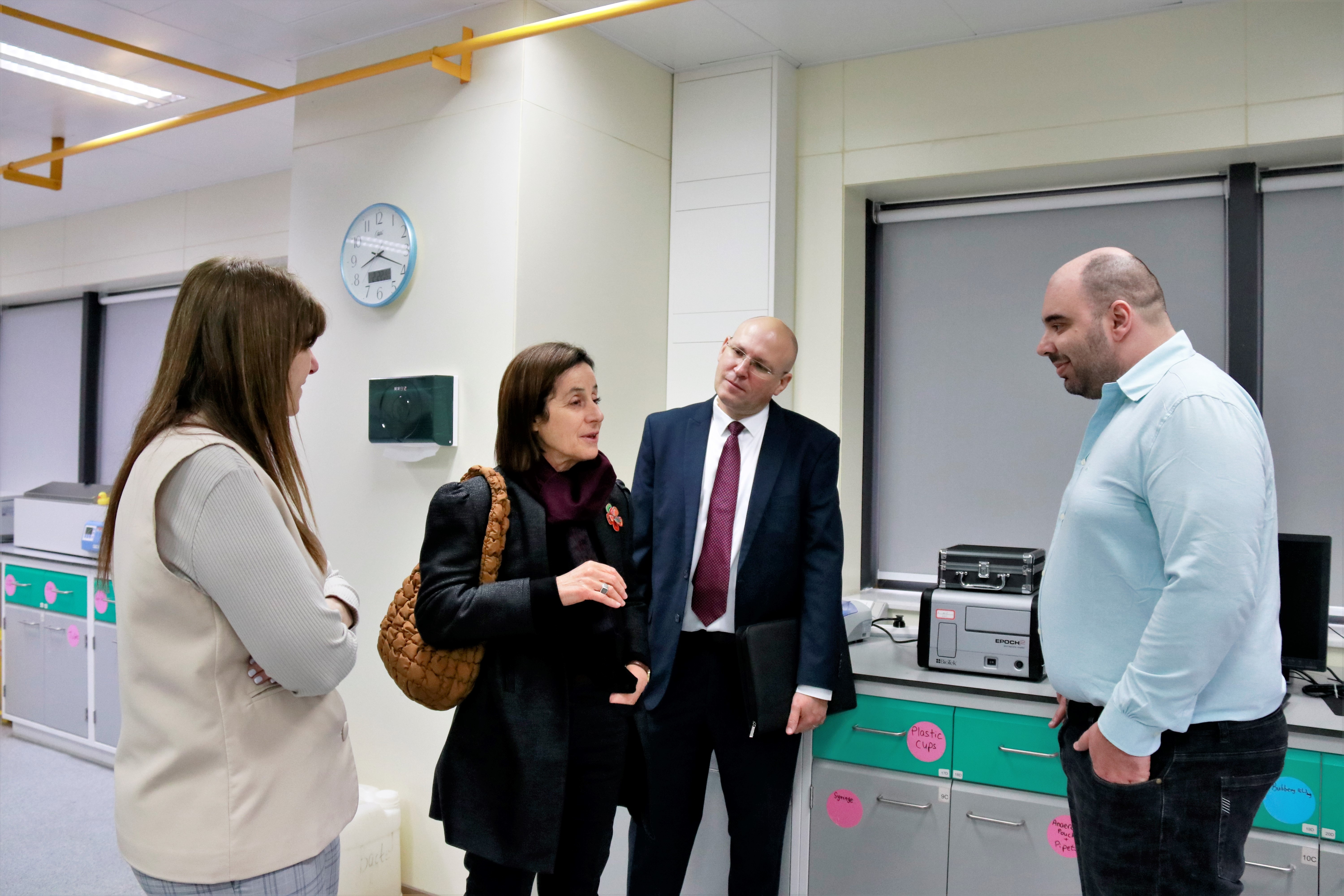 嘉賓一行參觀了廣以微生物實(shí)驗(yàn)室和冷凍電鏡實(shí)驗(yàn)室,與學(xué)校以色列籍教師代表和學(xué)生代表親切交流。