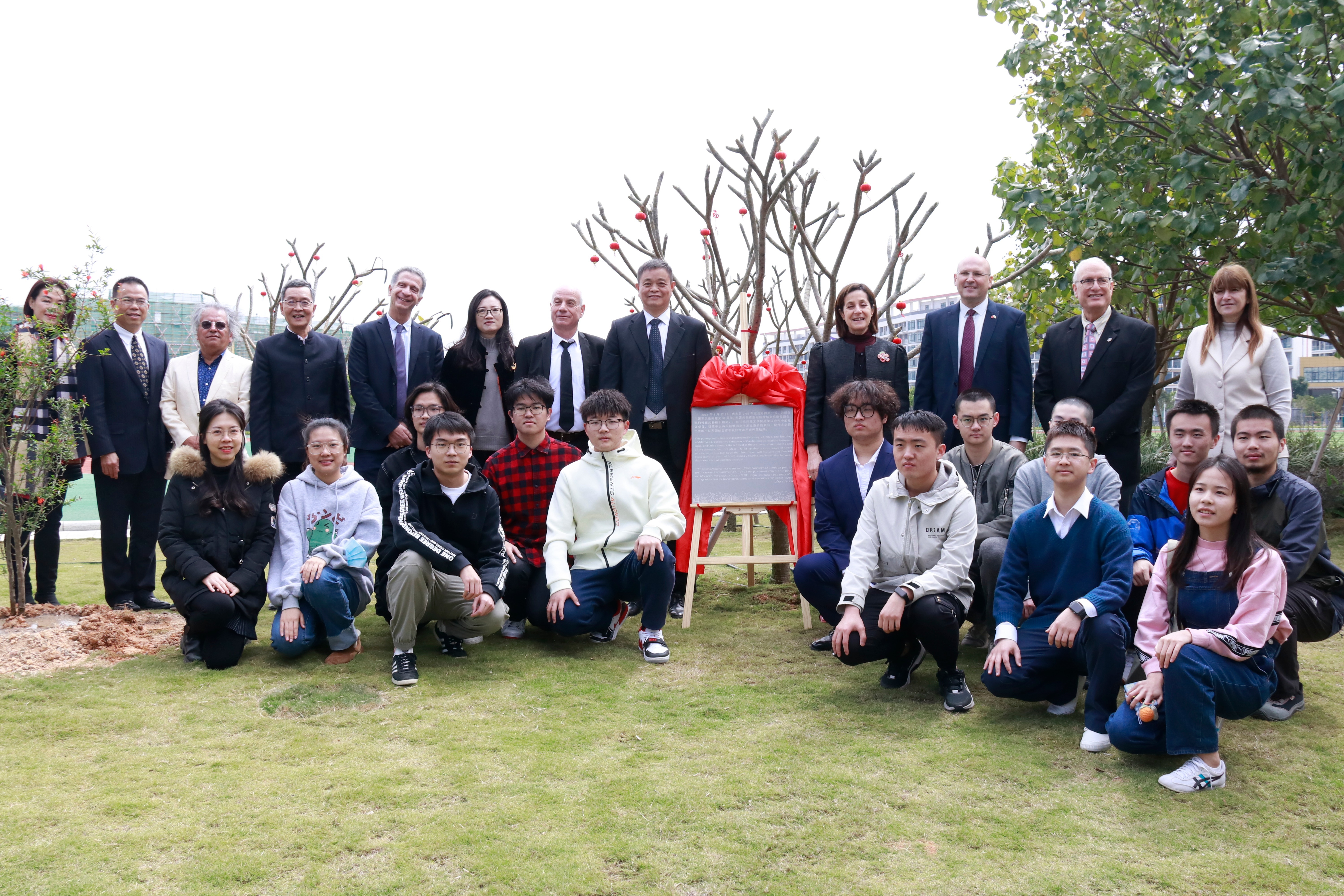 嘉賓們與廣以師生在石榴樹前合影