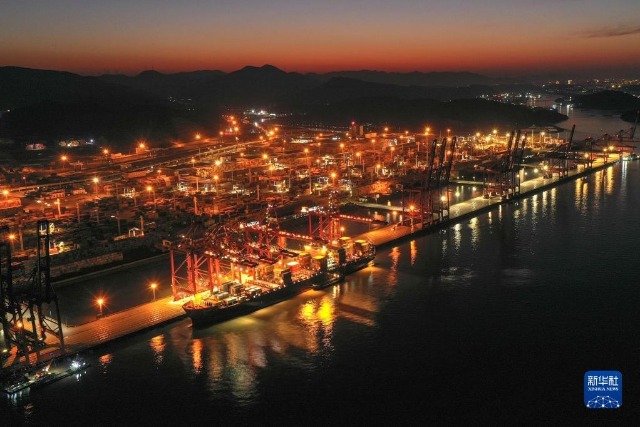 夜幕下,一艘貨輪??吭趯幉ㄖ凵礁鄞┥礁蹍^(qū)集裝箱碼頭(1月31日攝,無(wú)人機(jī)照片)。新華社記者 黃宗治 攝