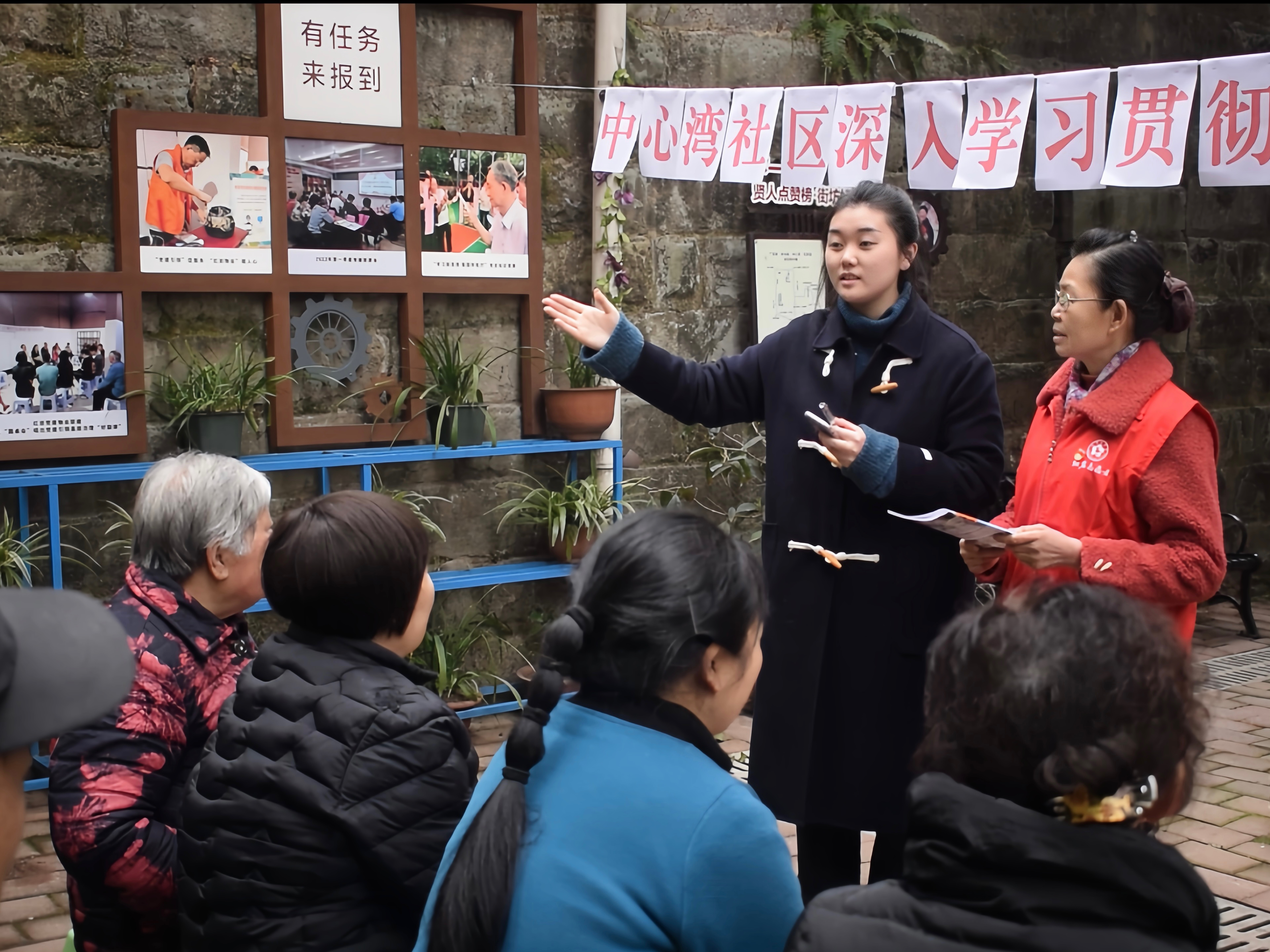 大學生黨員宣講團成員廖鑫宇在重慶沙坪壩區(qū)中心灣社區(qū)開展院壩宣講。廖鑫宇攝