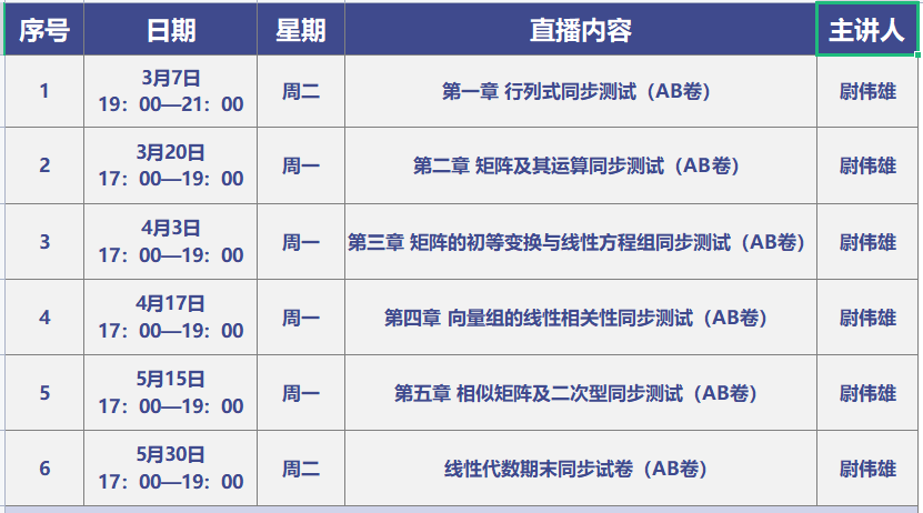 3月7日起,“高等數(shù)學(xué)伴學(xué)計(jì)劃”線性代數(shù)同步測試卷精講將正式上線,共設(shè)置6講直播課程,全面提升解題能力,助力破解線性代數(shù)難題,成功通關(guān)。