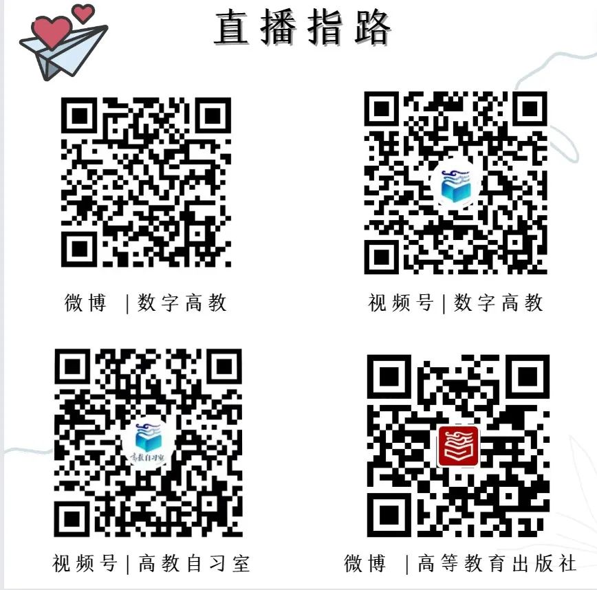 本次活動(dòng)將通過高教自習(xí)室、數(shù)字高教微博、高等教育出版社微博及視頻號(hào)進(jìn)行直播,掃描下方二維碼即可觀看。