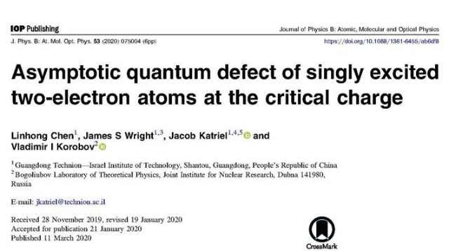 2019年,這顆默默扎根的種子終于破土而出。大二期間,陳林泓憑借優(yōu)異的成績脫穎而出,獲得教授邀請參與科研項目,并前往俄羅斯杜布納聯(lián)合核子研究所(JINR)進(jìn)行學(xué)習(xí)。隨后,陳林泓以第一作者在國際物理期刊《物理學(xué)報B:原子、分子與光學(xué)物理》(Journal of Physics B: Atomic, Molecular and Optical Physics)上發(fā)表學(xué)術(shù)論文,成為首位以第一作者身份在SCI期刊上發(fā)表論文的廣以學(xué)子。